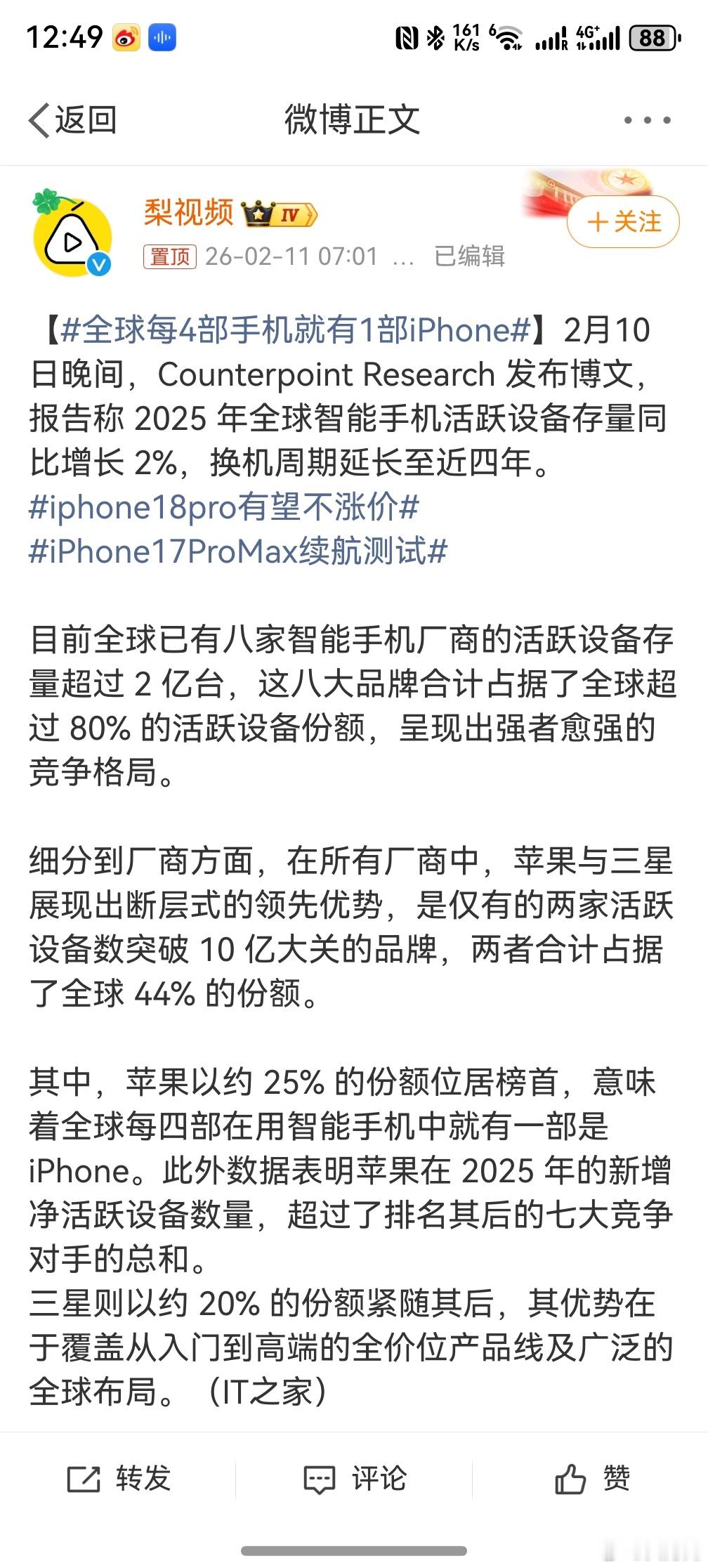 全球每4部手机就有1部iPhone ,所以说苹果这个品牌就很奇怪,在网上看网友的各种吐槽,感觉这个牌子都没人买了,但是线下的销量却永远不受影响,甚至还能再创新高。