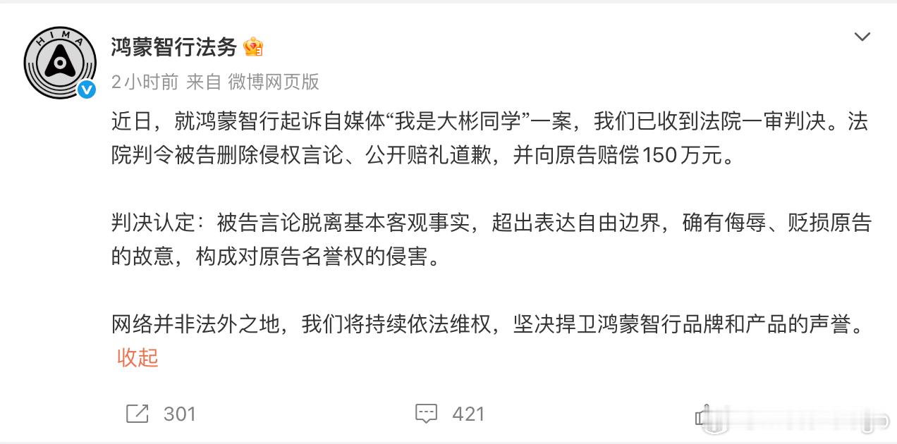 鸿蒙智行起诉我是大彬同学一审判决我是大彬同学被判赔鸿蒙智行150万