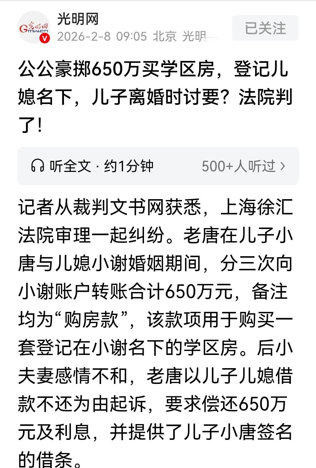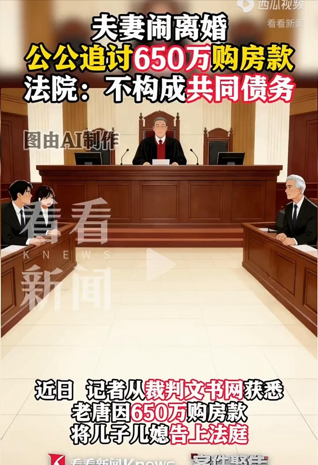 白嫖成功!上海,儿子儿媳闹矛盾,公公为了哄住儿媳不离婚,豪掷650万买学区房,登记儿媳名下。不料,儿媳拿到房子产权不久,再次提离婚,公公立马将儿子儿媳告上法庭称,钱是给儿媳孙子买学区房的,离婚就不是儿媳了, 并拿出儿子签名的借条,要求儿子儿媳共同还款650万。然而,法院判决下来后,公公傻眼了。 事情从2020年年底说起,唐先生和小谢登记结婚后没多久就迎来了怀孕的消息,可紧接着突然爆出一个隐情,小谢在婚后才知道丈夫之前有过一段婚姻。 这件事让她非常受打击,她觉得自己被骗了,内心的冲突从那一刻开始埋下。 更糟糕的是,小唐在得知老婆怀孕后,怀疑孩子不是自己的,非要做亲子鉴定。 小谢拒绝了一段时间,最后实在拗不过,只得接受检测,结果显示孩子确实是小唐的。 可人心不是断裂的瓷碗能修补,确认过孩子之后,小谢仍然没有原谅丈夫。 她闹着要离婚,还表示不排除终止妊娠。 眼看家庭要散架,老唐急了,觉得这个时候坐视不理,可能孙子就没了,儿子的婚姻也彻底砸了。 为了挽回局面,他连哄带劝,又是道歉,又是出钱。 从2023年4月起,他分三次往小谢账户转了650万元,转账备注都明确写着购房款。 他还承诺,新房写在小谢的名下,将来是孩子的上学用房,也是对她的补偿和安抚。 小谢接受了,迅速买下一套学区房,房产证也确实写的是她自己。 这650万似乎成了最后一根绳子,勉强把这个家庭维系了下来。 同年6月,孩子顺利出生,老唐以为事情就此翻篇了,小两口的日子也许能重新开始。 谁料到了9月,问题重新爆发,两人开始分居,小谢再次提出离婚。 老唐明白这婚姻再难维系,但他心里过不去这笔钱的坎。 他担心,儿子没留住,孙子也可能被带走,连房子都落在了对方手里。 思来想去后,他决定走法律程序,起诉儿子和儿媳,要求归还这650万。 为此,他提交了一张借条,上面只有小唐的签名。 小唐也站到父亲一边,声称这笔钱是夫妻二人一起商议后向父亲借的,他愿意还款。 小谢面对法庭时却是另一副说法,她表示自己从未听说这笔钱是借款,也未签字同意过,更没有承诺还钱。 她强调,这是因为丈夫隐瞒婚史、怀疑亲子身世造成了严重伤害,是老唐主动对自己进行的补偿。 双方入情入理,各说各话。 法庭没有只看表面材料,而是详细审查了证据。 首先是借条问题,这张关键的借条只有儿子签字,并不能证明夫妻双方对该债务达成一致,也没有证据表明小谢事后知道并认可。 其次是转账情况,公公三次转账都备注为购房款,且资金直接用于购房,房屋产权人也不是共同所有,而是小谢单独所有。 法院认为,购房属于重大财产支出,不在夫妻日常生活范畴之内,不能自动认定为夫妻共同债务。 结合《民法典》的相关规定,认定这650万不符合“夫妻一方事后追认”的情形,也没有证据显示小谢知情同意这笔借款。 最终法院作出了判决,驳回了公公全部诉请。 整件事其实更说明了一点,家里的钱不是想怎么操作就怎么操作。 尤其是父母出资为子女家庭买房时,更要在法律上讲清楚是借款还是赠与。 一旦感情破裂再想翻旧账,就算是一家人,法院也认证据不认亲情。 小谢最后并没有要分千万婚房,而是带着孩子住进自己名下的新房。 老唐看着这套为挽回家庭掏空多年积蓄买下的房子,最终变成了与自己无关的财产,坐在家里一言不发。 他以为用650万可以换来一家团圆,没想到换来的只是一次彻底的现实教育。 通过这件事可以看出,夫妻之间的裂痕,一旦涉及信任和尊重,靠金钱很难弥补,家庭矛盾演变成金钱诉讼,也是一种情感彻底破裂的象征。 明确责任和边界,在任何关系中都必须被重视,否则再多的金钱,也换不回来一个完整的家。