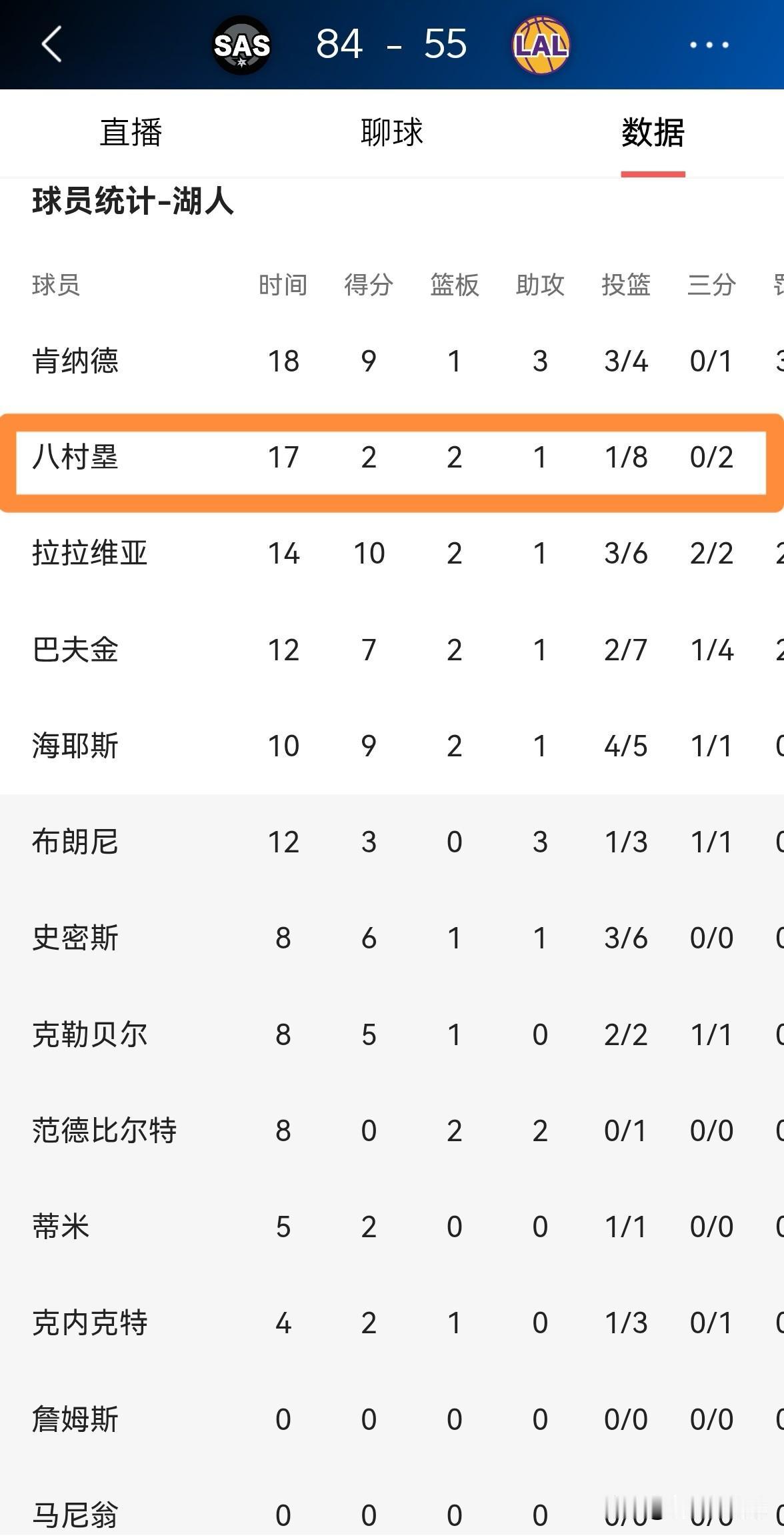 湖人大将八村塁真是一个大笑话!在今天进行的湖人和马刺的比赛中,目前双方的上半场比赛已经结束,湖人以55:84落后对手多达29分。值得一提的是,在前两节比赛中,八村塁在球队多名主力缺阵的情况下本想大发神威,却打得极其的糟糕。 在上半场比赛中,八村塁首发出战17分钟,投篮8中1,其中三分球2中0极其低效的得到2分,他的场上正负值为-16。 毫不夸张的说,八村塁在前两节比赛中的表现简直就是一场灾难,他在主场球迷面前成为了一个大笑话。