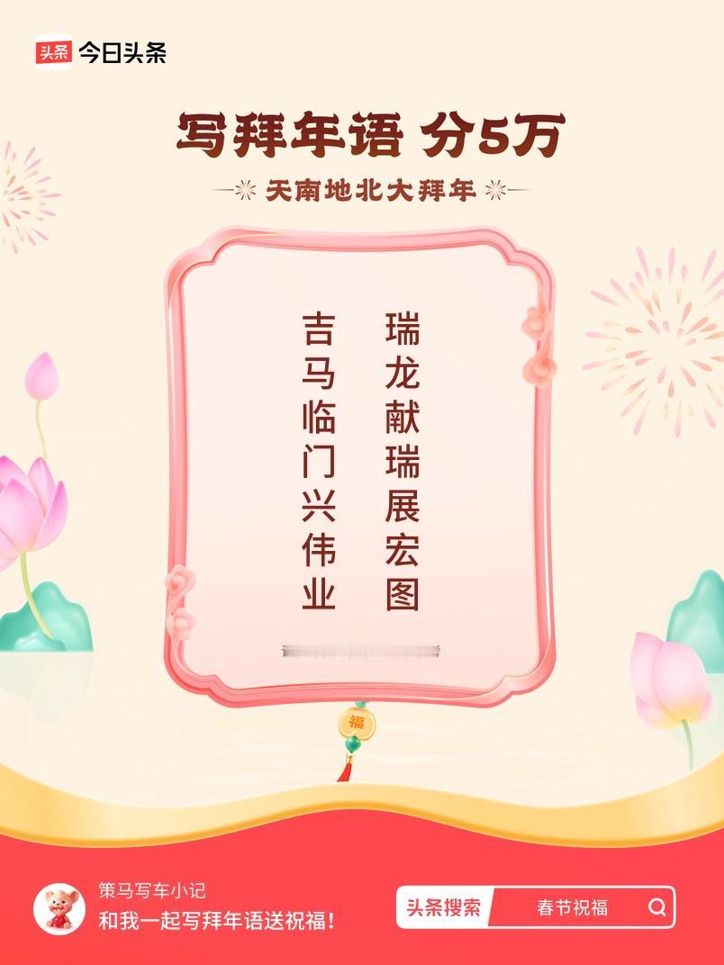 写拜年语送祝福新春拜年送祝福!我的祝福是:“吉马临门兴伟业,瑞龙献瑞展宏图”!快来一起写祝福吧戳这里,一起领红包>