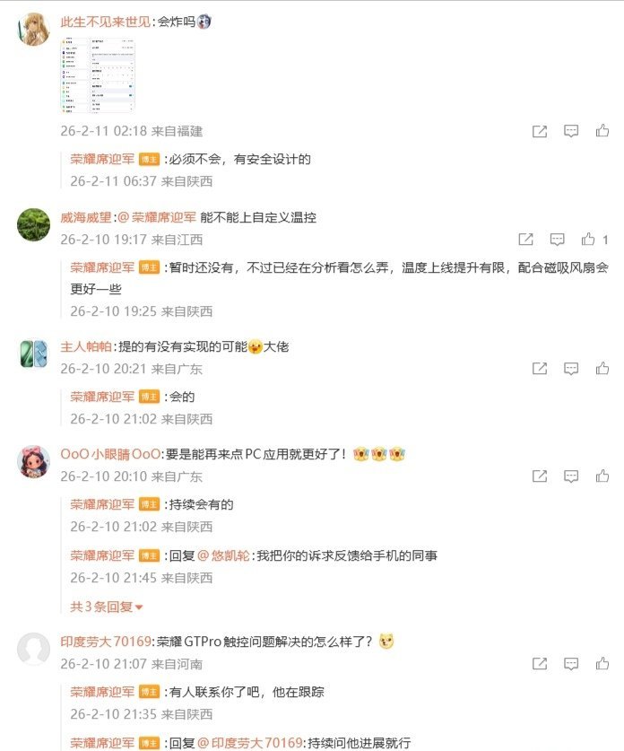 荣耀席迎军还在评论区与网友展开互动。有用户将极客中心的自定义选项都拉满后询问:“会炸吗?”席迎军表示:“必须不会,有安全设计的。”