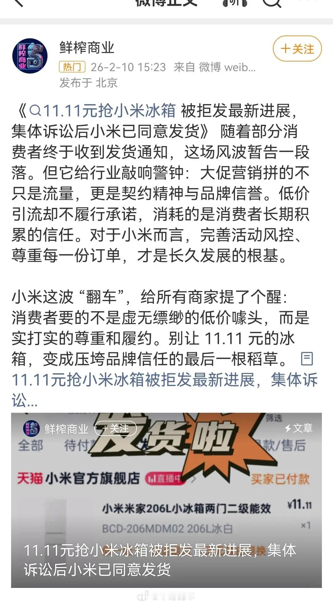 11.11元冰箱后续,大厂没赢,消费者集体诉讼后发货了,早知如此,何必当初