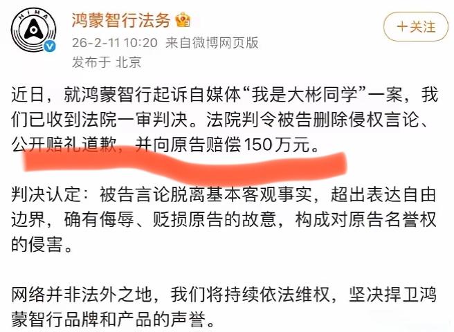 鸿蒙智行法务真牛!起诉自媒体博主我是大彬同学一审被判赔150万,并公开赔礼道歉不知道这博主靠黑别人得来的流量赚取的钱够支付罚金吗?央视新闻也报道了相关内容,这些歪瓜裂枣玩意儿真不知道咋想的,干这种事不怕遭报应吗?