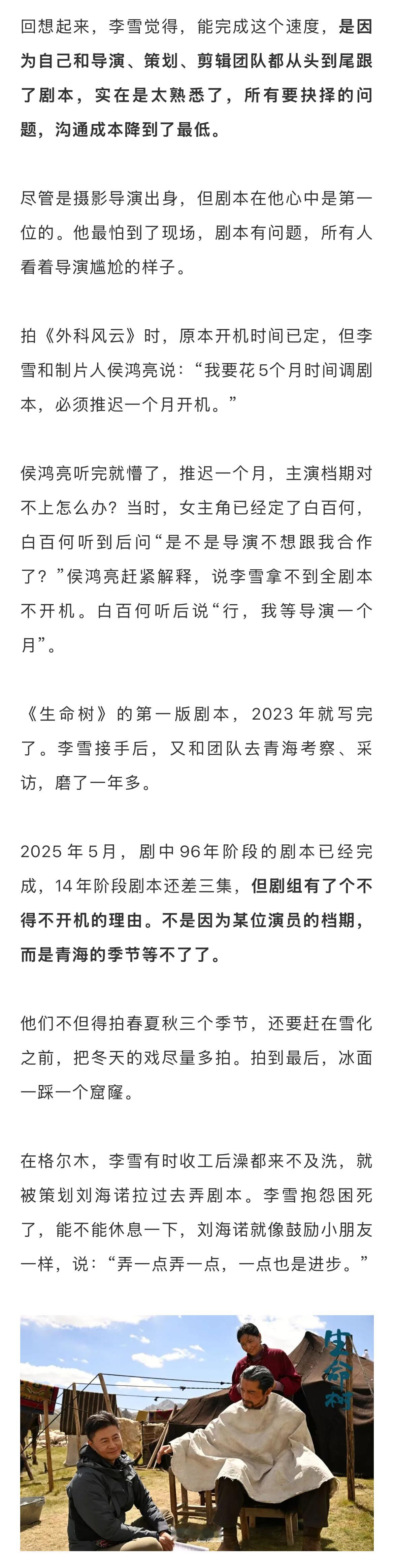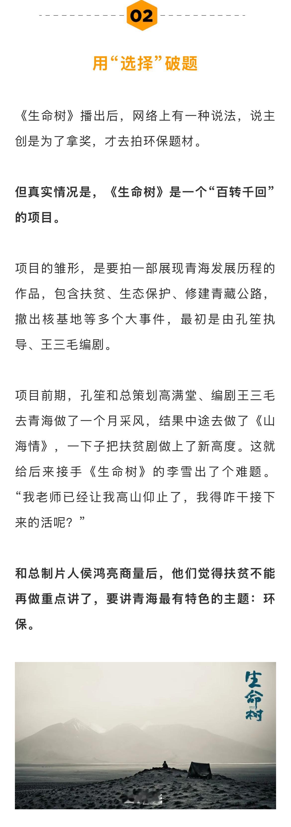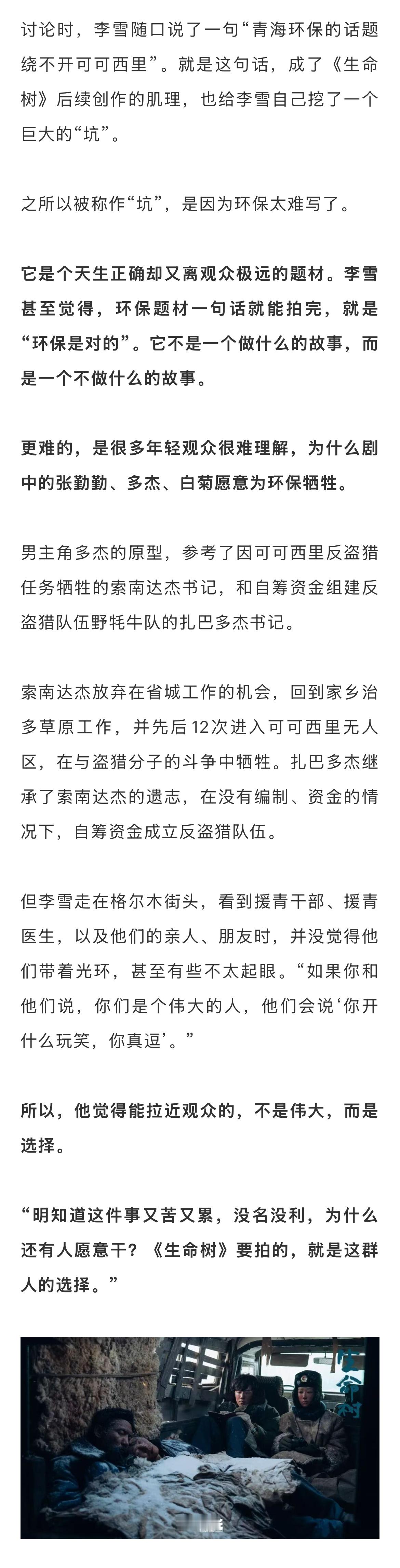 导演回应生命树豆瓣一星差评生命树导演说很佩服杨紫 《生命树》是一个“百转千回”的项目。项目前期,孔笙和总策划高满堂、编剧王三毛去青海做了一个月采风,结果中途去做了《山海情》,一下子把扶贫剧做上了新高度。这就给后来接手《生命树》的李雪出了个难题。后来讨论时,李雪随口说了一句“青海环保的话题绕不开可可西里”。就是这句话,成了《生命树》后续创作的肌理,也给李雪自己挖了一个巨大的“坑”。杨紫胡歌拍生命树都出现了高反