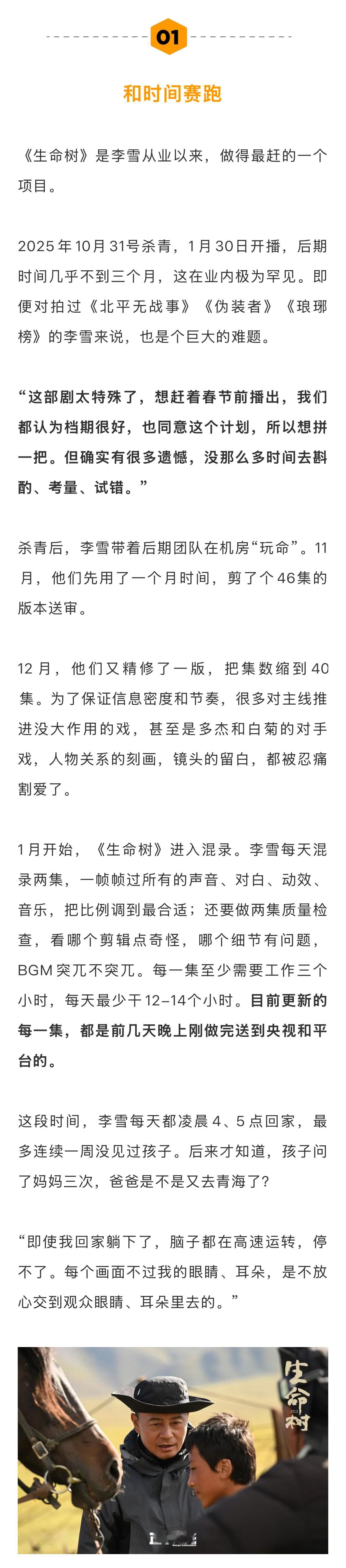 导演李雪平时不太上网。但开播后,他也从同事那里听说,《生命树》的豆瓣曾在短时间内涌入大量一星差评,导致豆瓣短评一度被锁。“这是我不提倡,也认为不健康的舆论生态,这样无助于好的文艺作品的产生,更是对每一个文艺工作者的伤害,是共输。”