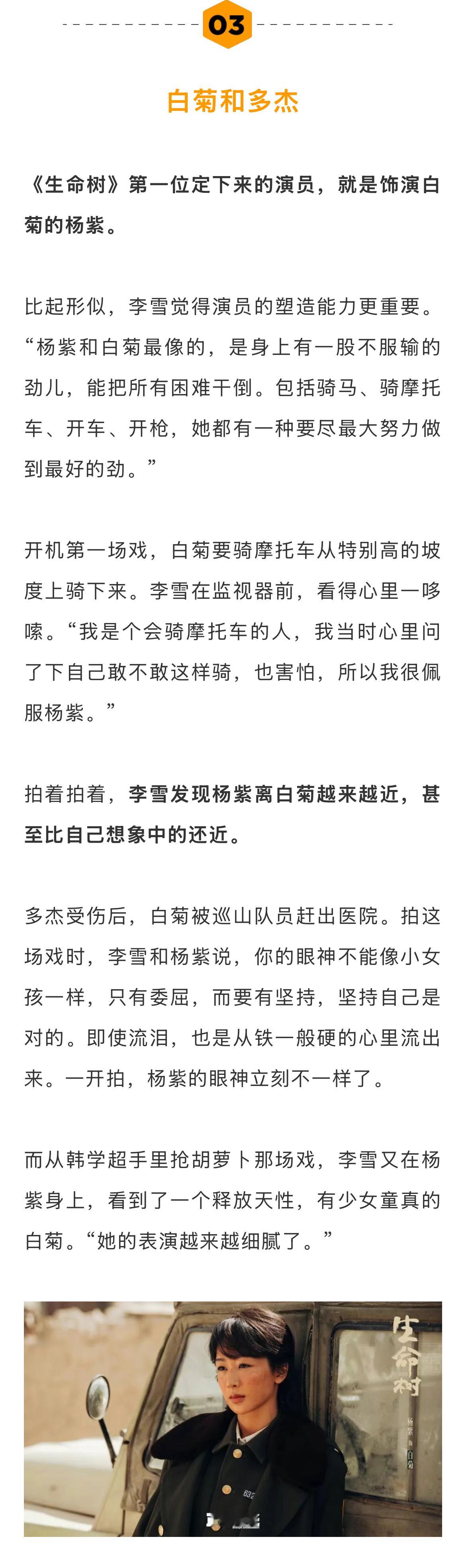 杨紫是《生命树》定下来的第一位演员,比起形似,李雪觉得演员的塑造能力更重要。“杨紫和白菊最像的,是身上有一股不服输的劲儿,能把所有困难干倒。” 开机第一场戏,白菊要骑摩托车从特别高的坡度上骑下来。李雪在监视器前,看得心里一哆嗦。“我是个会骑摩托车的人,我当时心里问了下自己敢不敢这样骑,也害怕,所以我很佩服杨紫。”