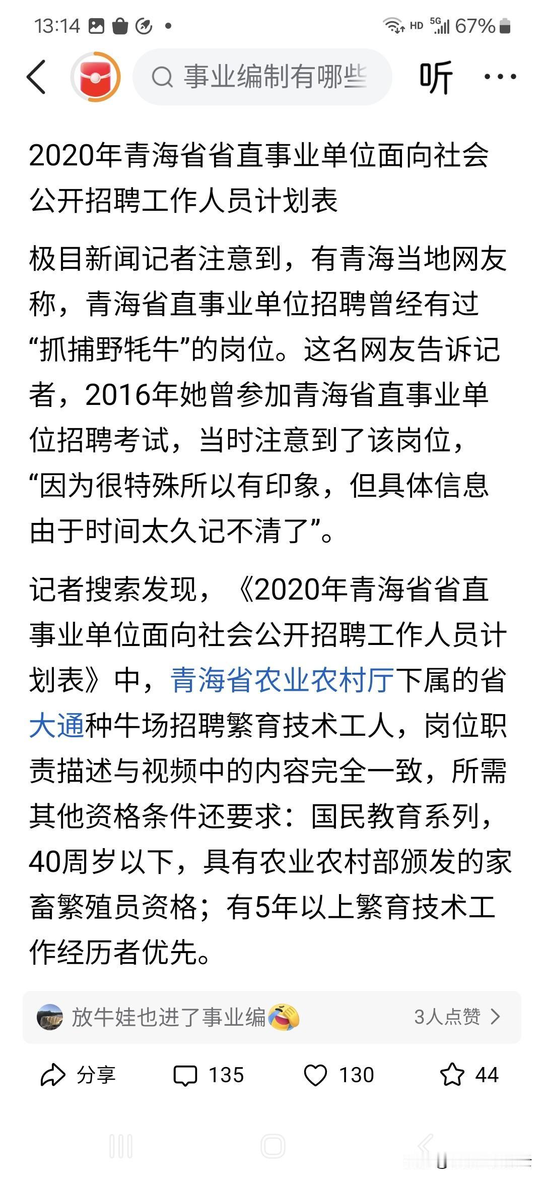 青海这个事业单位招聘要求太高了,只有神仙能做到吧?“能独立抓捕野牦牛”,野牦牛现在存量不到2000头,一级保护动物,抛开法律责任不说,野牦牛体重600公斤,力气大得很,丰田陆巡能被它顶翻,在平均海拔4500以上的羌塘高原,奔跑时速可达60公里。试问啥人能独立捕捉?