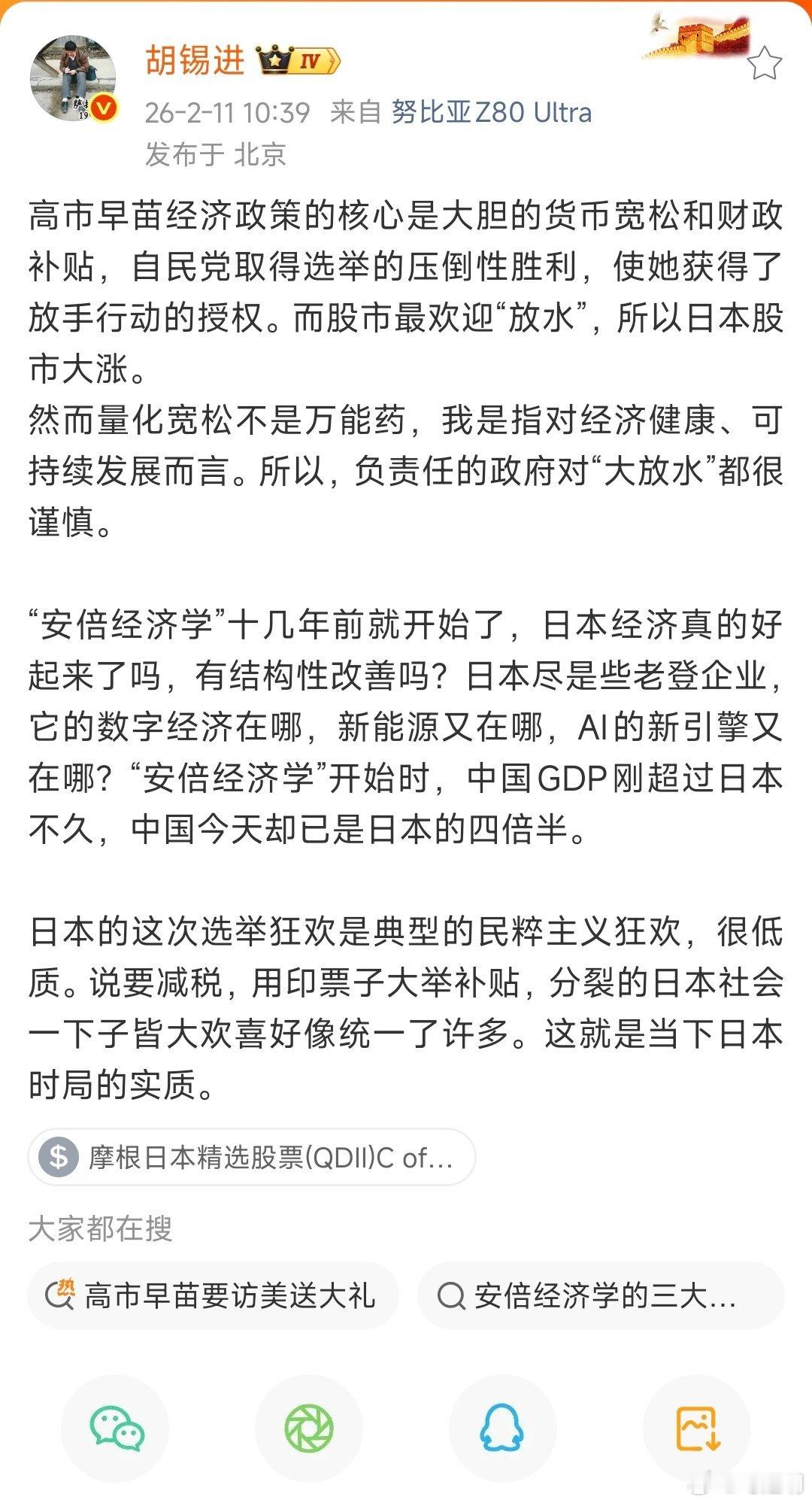 胡锡进老师正告日本高市政府,大胆的货币宽松和财政补贴的“量化宽松”政策不是万能神药。他特别注明“是针对经济健康和可持续发展”。