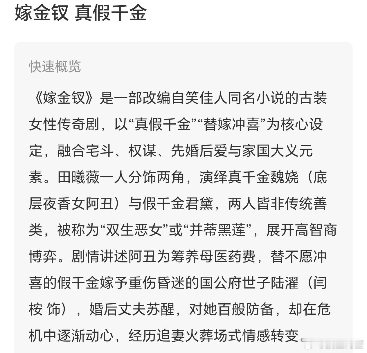 原来我一直把《嫁金钗》和《金枝》搞混了……总觉得金枝也要让女主一人双角。但是剧情