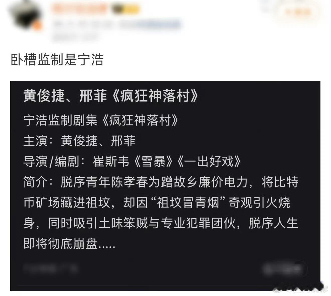 邢菲生万物后首传进组邢菲终于有新剧进组消息啦!网传将出演宁浩监制的《疯狂神落村》,剧情疯癫带感——脱序青年把比特币矿场藏进祖坟,还引来笨贼与犯罪团伙,光听设定就超上头。