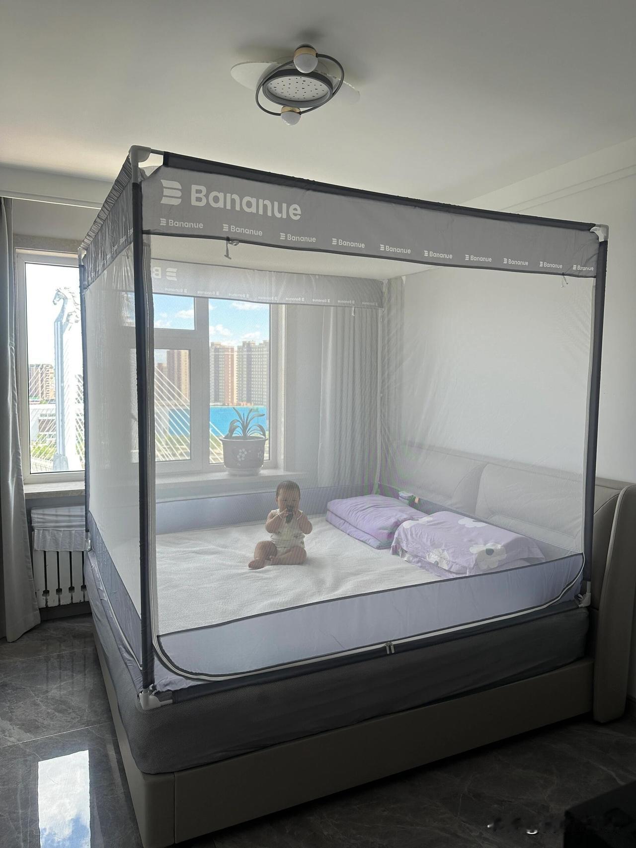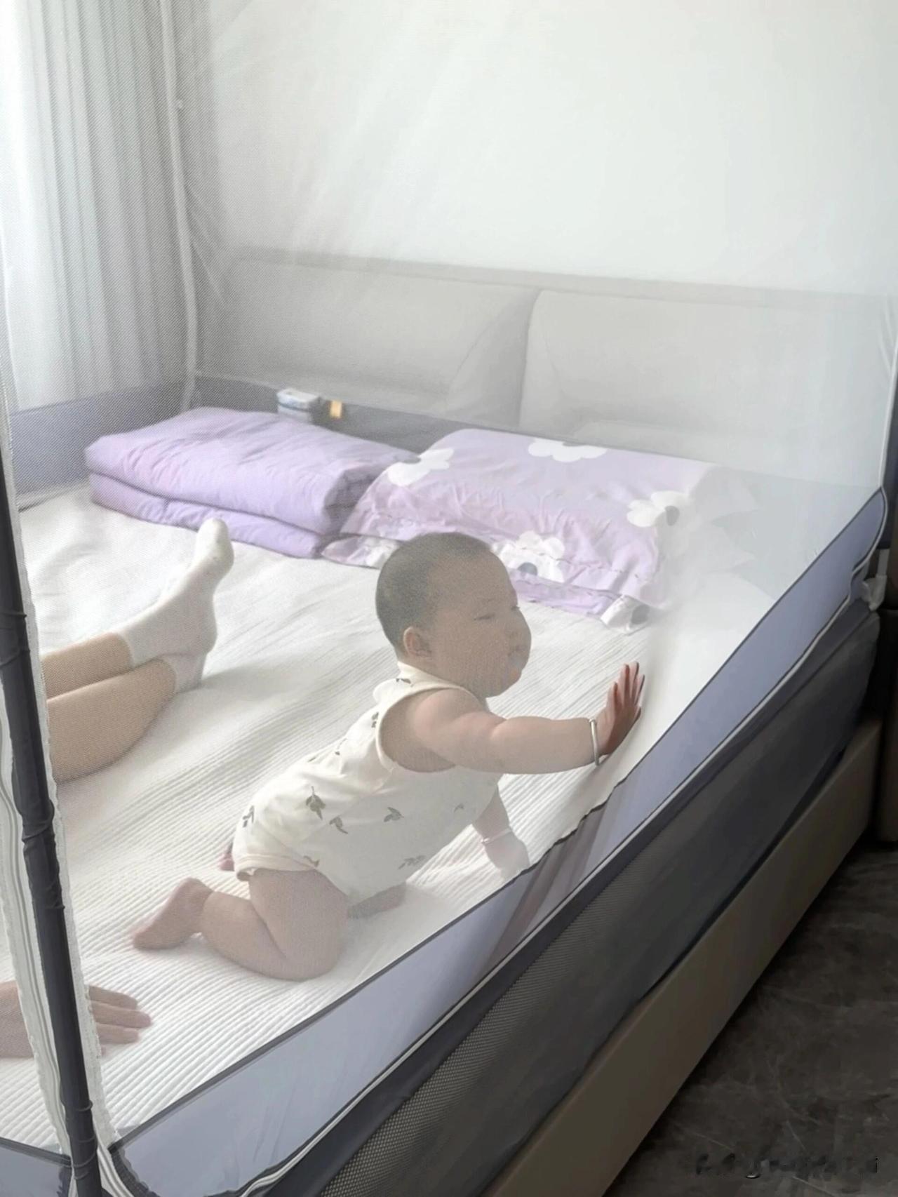 回家一看天塌了,爸爸带娃活着就好。 果然有危险的时候爸爸最安全 没有危险的时候爸爸就是最大的危险 出去逛街回家 抬头一看天都踏了 - 宝爸带娃给娃放蚊帐上边了。。。 宝宝自己在防摔蚊帐上面爬来爬去 好在这蚊帐够结实能承受得住宝宝重量 而且娃她爸也在下面打掩护看着宝宝爬 不然她爸早就被我收拾了一顿 - 这不妹妹已经6个月了,自从解锁攀爬技能后,一天天生怕她摔着磕着,普通的床围栏其实我们也买过,换床单有点费劲不说,上下床总会嗝一下,主要的还很挑床,像家里内嵌床或者我家这种有床头的,尺寸总是不会严丝合缝,还很容易卡住妹妹的小手小脚 - 后面跟她爸爸商量了好久,还是闲置了围栏,换了防摔蚊帐,想着蚊帐全包围的更严实一些而且这种床笠款,四面包裹中间镂空,跟床之间也没有缝隙,下边网罩可以450度裹住整个床垫,比带绑带的蚊帐更稳一些,平时睡醒了,也不用担心她会掉床,随便妹妹爬来爬去的蚊帐都可以稳稳兜住她,而且换床单也不费劲,直接扒拉下来交给洗衣机就行 - 支架是加粗加厚的六棱螺纹碳素钢管,就算大人使劲靠也很稳,平时爸爸出去上班,我带宝宝在蚊帐里边玩靠着也是很稳的,网纱双层加密的,蚊虫🦟进不来一点,宝宝老是喜欢拿手去抠蚊帐,也是抠不坏那种,很结实耐用,之前担心小户型装了蚊帐会压抑,没想到1米7的高度蛮宽敞的,抱着宝宝上面还有很大的空隙~ 而且三面蚊帐都可以打开,上面还有挂钩,平时可以收上去,床头还有预留的充电口和收纳袋,一般宝宝的纸尿裤,奶瓶啥的就放里面,喂夜奶啥的也方便。 - 以前眼睛恨不得一天24小时看着宝宝,现在装了这个蚊帐后,也不用围着她团团转了,忙的时候拉链一拉,宝宝自己在蚊帐里面玩的也老开心了,个人感觉比围栏好使,夏天还能防蚊子,真心建议纠结围栏跟防摔蚊帐的姐妹,可以试试这个半弦月防摔蚊帐 ⚠️就是爸爸这个行为就不建议大家模仿尝试啦