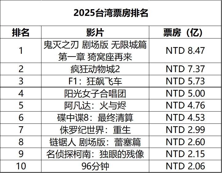 2026年第6周台湾票房 :1.《阳光女子合唱团》稳居冠军,最新票房破5亿新台币排名2025年度第4,台湾影史第26,台湾本土片第2,即将成为台片影史冠军;2.《疯狂动物城2》累计票房7.37亿排名台湾影史第9;3.《庇护之地》在新片中成绩最佳。(单位:新台币 数据:台湾电影及视听文化中心)
