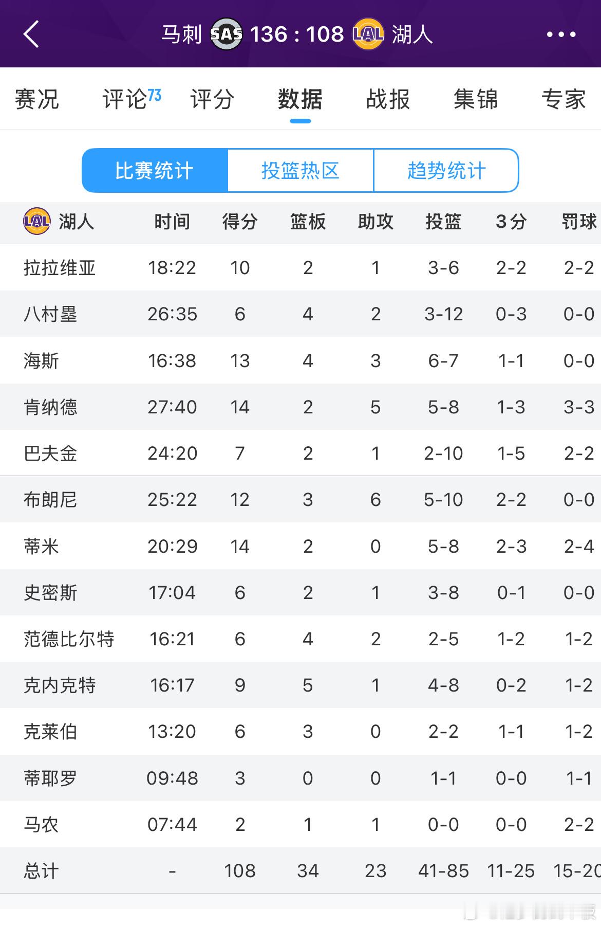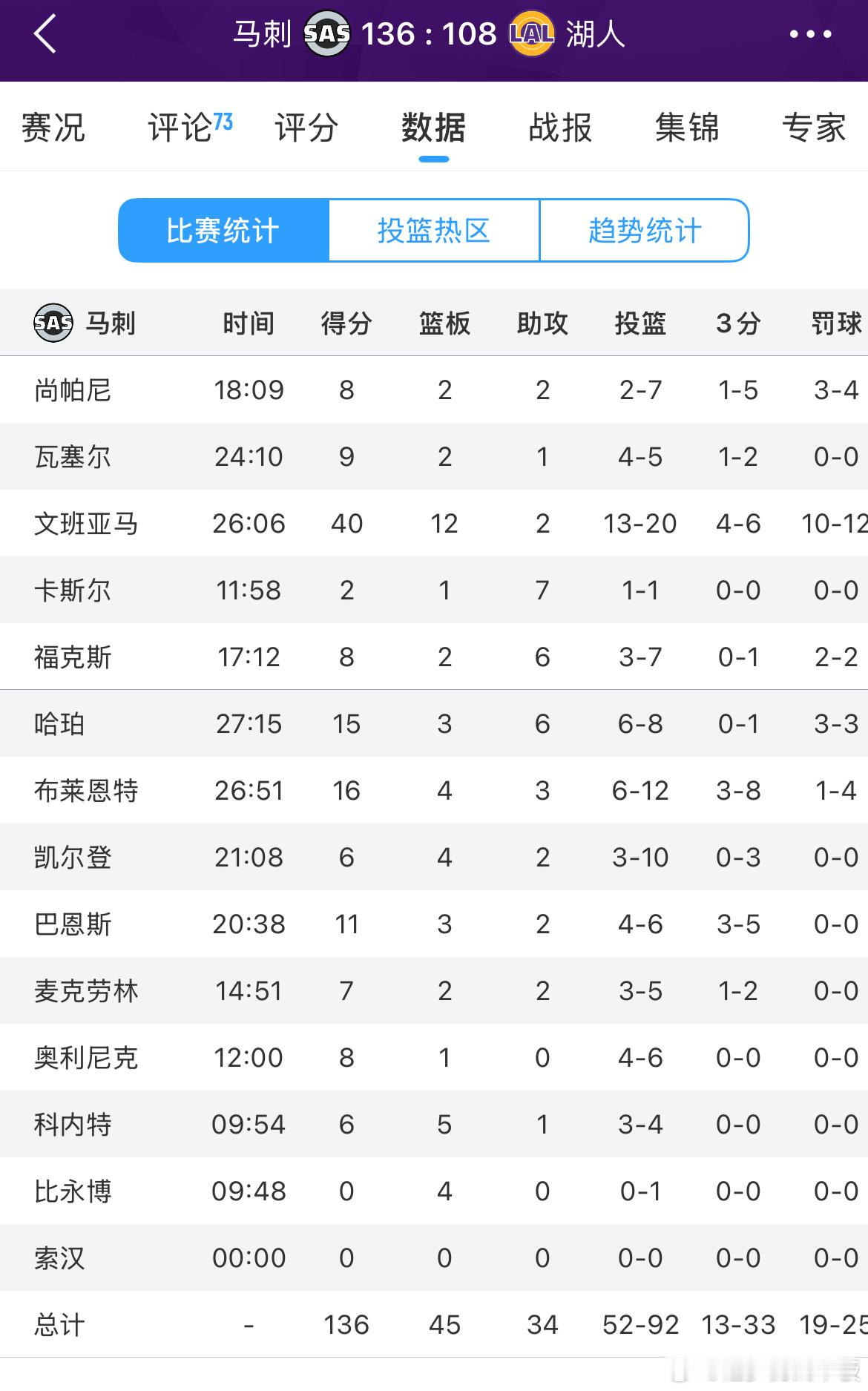 文班亚马40分12板,肯纳德14分,朱蒂米14分,布朗尼12分马刺vs湖人