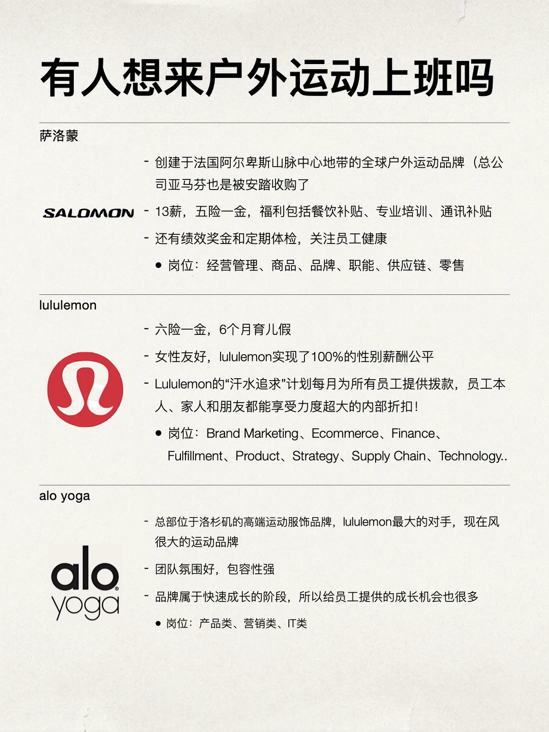 像始祖鸟、Salomon这些品牌背后大多都是外企,除了卖装备,品牌的运营也包括活动、赛事、内容、社群运营这些,所以岗位机会很多