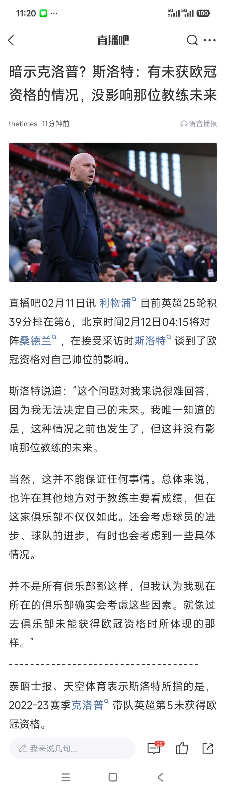 斯洛特说克洛普没获得欧冠资格,还不是照样留任了? 所以他本赛季也可以不拿英超前五,不参加欧冠继续执教利物浦? 最近他的借口有点多,利物浦球迷很反感,曼联球迷很喜欢,觉得像腾嗨。[捂脸][灵光一闪]