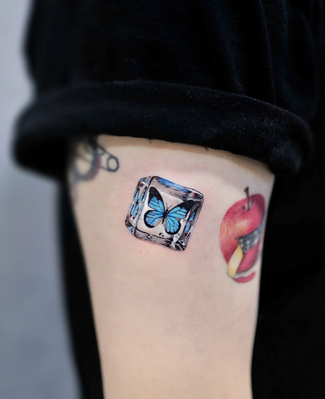 把蝴蝶放进冰里 像是按了一下暂停键 脆弱被留在里面 暂时 不参与温度 Done at ink room 感谢认领这颗小冰块🦋 旁边的🍎7个月恢复后 无补色