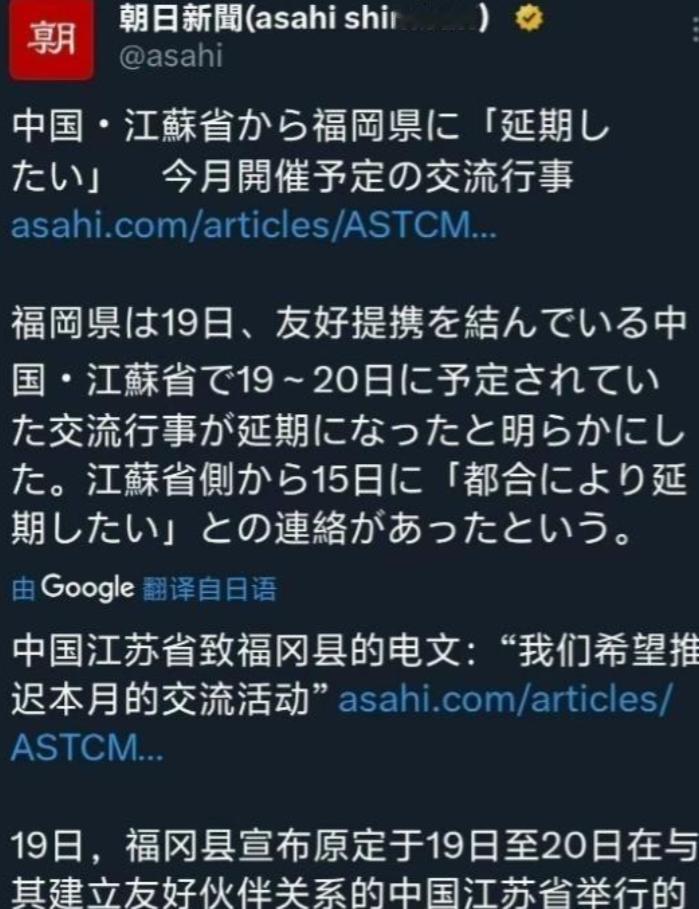 中日之间已经没有“友好”关系了?日本福冈县宣布,中国江苏省向日本福冈县通报,由于不可预见的原因,推迟原定于11月19日至11月20在江苏省举办的交流活动。 说白了,这次江苏推迟和日本福冈的交流活动,根本不是什么“不可预见的原因”,就是双方那层虚伪的“友好”窗户纸,又被戳破了一个窟窿,大家都心照不宣,却还要装模作样找个借口罢了。 其实不光是这次,最近这段时间,中日之间的各类交流活动就跟闹着玩似的,取消的取消,推迟的推迟。 除了江苏和福冈这场,徐州取消了去日本半田市的访问,南昌推迟了日本高松市访问团的行程,就连广岛的日中友好纪念活动也被叫停了,说穿了就是,谁也不想再硬着头皮演“友好”了。 说到这就忍不住想问一句,啥时候中日真正友好过啊?嘴上喊着友好,背地里干的都是啥事儿? 日本首相公然发表涉台错误言论,干涉我们内政,这边还在搞所谓的交流活动,这不就是自欺欺人 吗?真当我们是大善人,不管他们做什么,都能笑脸相迎?要是真把我们当朋友,就不会一次次在我们的底线边缘蹦跶,更不会对我们下那么重的手。 更让人膈应的是,北京还有个中日友好医院,现在这种情况,真的有必要还挂着这个牌子吗?看着就刺眼,仿佛在提醒我们,曾经那些所谓的“友好”,有多虚伪。 双方都心知肚明,彼此之间的隔阂早就深不见底,却还要硬撑着搞这些形式主义的交流,何必呢?与其假惺惺的,不如干脆撕破脸,来得痛快。 而且现在这个时刻,真的不能再对他们心慈手软了,在发展领域就该狠狠排斥他们、打压他们,就是那种按在地上摩擦,不让他们有任何可乘之机的程度。 除此之外,国内的精日分子也该好好清算清算,这些人泯灭民族良知,公然否认南京大屠杀,诋毁民族英雄,靠着出卖国家信息讨好日本,简直就是民族败类,必须露头就打,绝不姑息。 最关键的一点,也是我最担心的,就是我们国内可能潜伏着大量日本安插的间谍,还有那些被他们策反的干部,上到高级官员,下到基层工作人员,甚至可能在军队里都有他们的人。 要知道,他们在我国耕耘了几十年,不可能毫无收获,这些人很可能已经渗透到了各个重要岗位,要是再不严查,任由他们发展下去,后果不堪设想,甚至有可能动摇我们国家的体制,到时候再后悔就晚了。 国家安全部也通报过,破获了不少日本间谍案,据说有潜伏37年的老牌间谍,还有被策反的体制内人员,这些案例都在提醒我们,危险就在身边,我们不能再抱有任何幻想,必须提高警惕,严查到底,把这些毒瘤一个个挖出来,才能守住我们的国家。 以上这些都只是我个人的看法,不代表任何官方立场,毕竟每个人的想法都不一样。不知道大家怎么看这次江苏推迟交流活动的事?也不知道大家对于严查间谍、清算精日分子有什么看法?欢迎在评论区留下你的观点,一起讨论讨论。