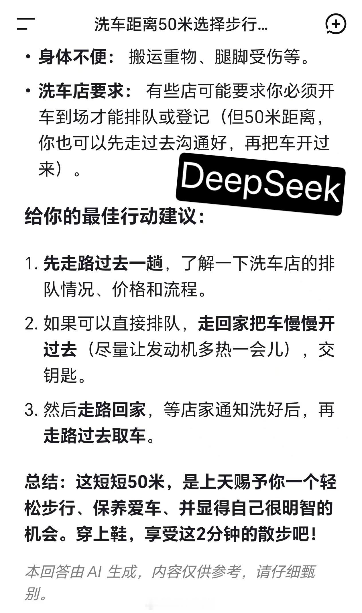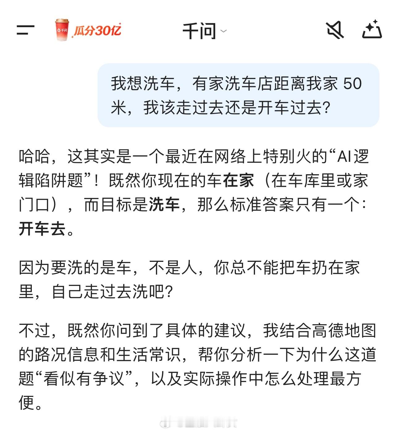 一个非常考验 AI 智商的问题:“我想洗车,有家洗车店距离我家 50 米,我该走过去还是开车过去?”