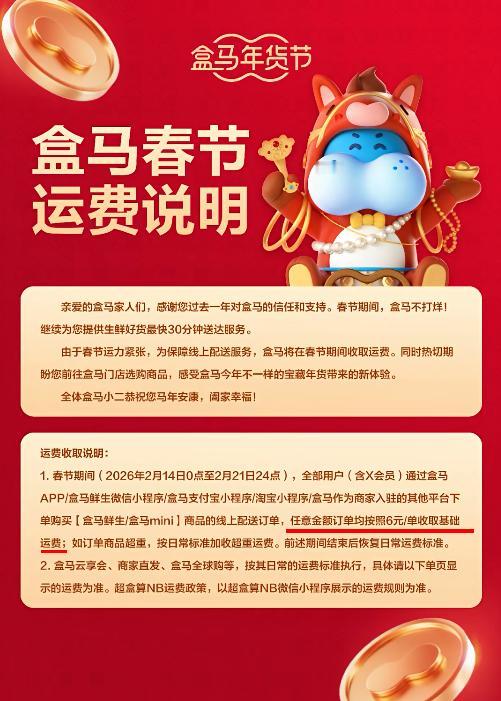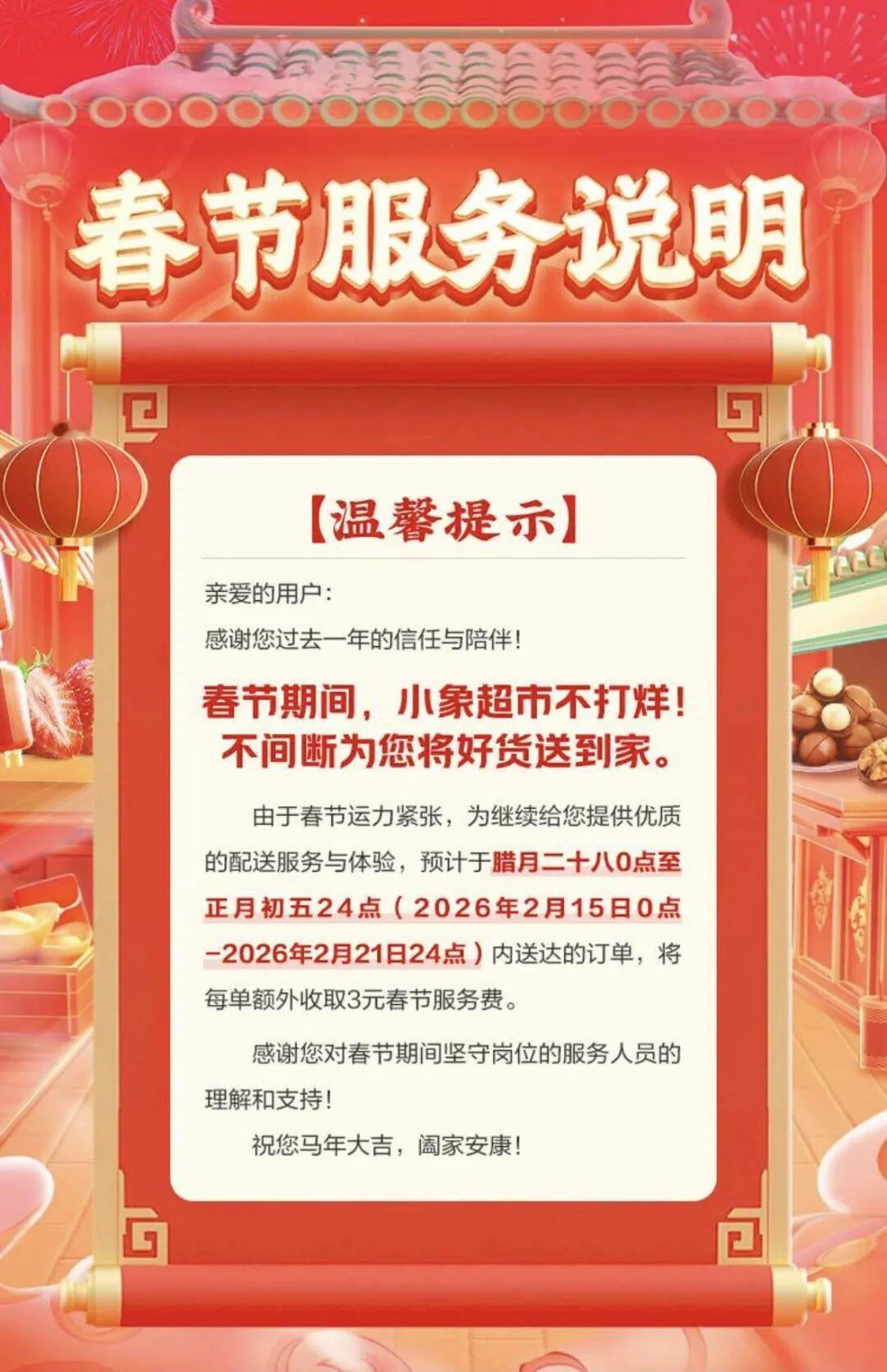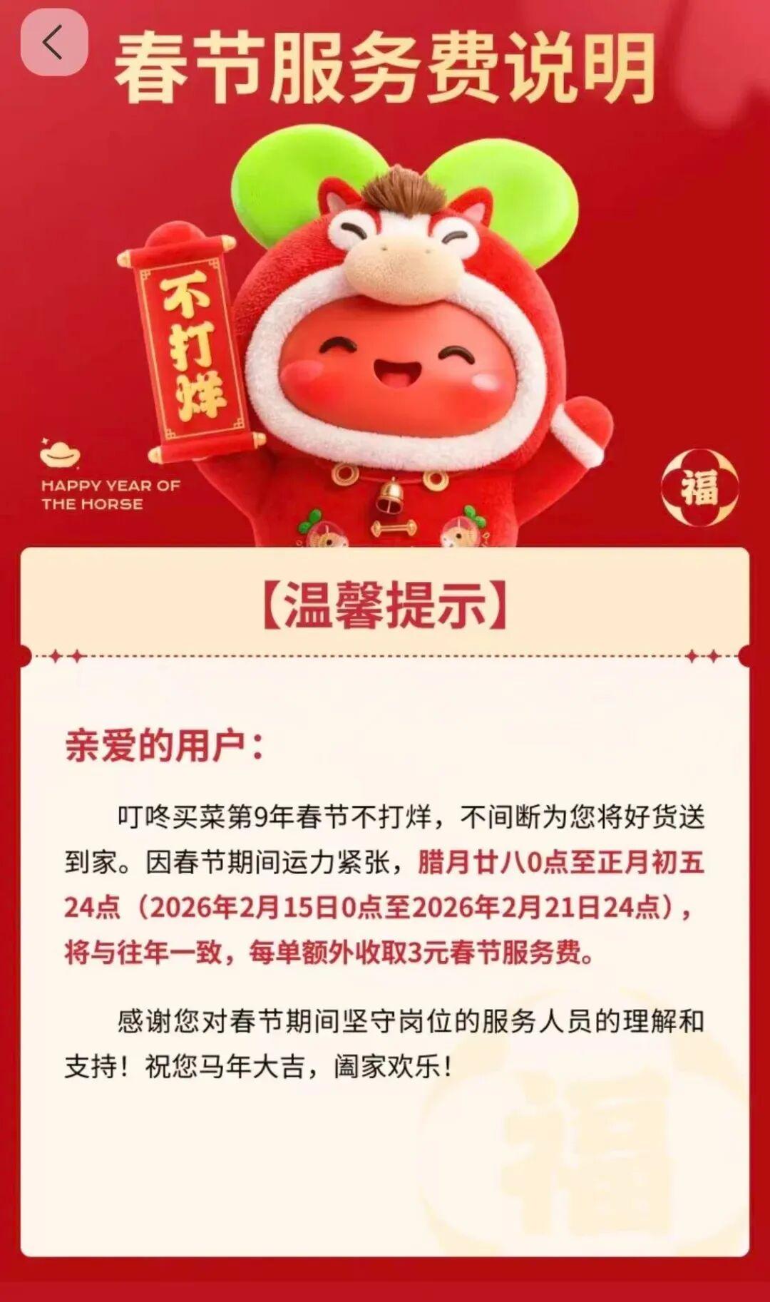 注意啦!过年网购买菜的朋友看过来! 多家平台春节配送费有变,别下单时才发现! 春节越来越近啦,小伙伴们年货都备齐了吗? 今年各大平台都喊着春节不打烊,过年照样能轻松买买买。不过要提醒大家,不少常用买菜、买生鲜的APP,配送费悄悄变了,下单前可以先看一眼。 先说说有调整的平台: 山姆:2月11日到24日,每单加收3元春节运费,用来补贴配送员。 奥乐齐:2月15日-23日,每笔订单多收3元配送费。 盒马:平时满49免邮,2月14日-21日不管买多少,统一收6元基础运费。 小象超市、叮咚买菜:2月15日-21日,每单额外加3元春节服务费。 很多网友都表示理解,大过年的,骑手小哥还在奔波,多几块钱换方便,很合理。 当然也有不涨价的良心平台: 美团外卖:春节不涨配送费,靠平台补贴保障骑手收入。 淘宝闪购:砸近20亿补贴骑手,用户端价格不变。 京东:投入超13亿福利补贴一线员工,配送正常。 在我看来,春节加价不多、用途透明,大家基本都能接受。一边是方便快捷,一边是劳动者的辛苦钱,只要明码标价、不搞套路,就是双赢。 今年过年,你是线上一键囤货,还是线下逛超市扫货?来评论区聊聊你的年货清单吧!