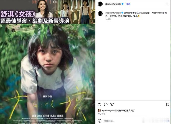 冯德伦回应舒淇入围金像奖 凭借《女孩》一作,同时入围了第44届香港电影金像奖最佳导演、最佳编剧、新晋导演三个奖项,她发文对此表示感谢,冯德伦调侃道:“通常金像奖都在你生日举办,希望今年都不例外。你拿奖,我不用买礼物。双赢。”