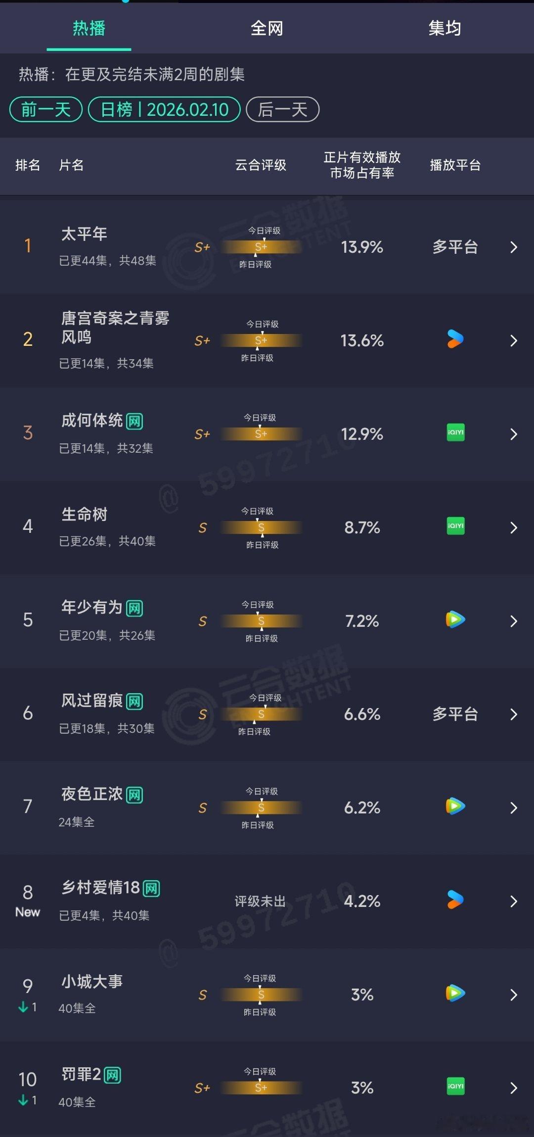 2.10云合:唐宫奇案13.6%成何体统12.9%