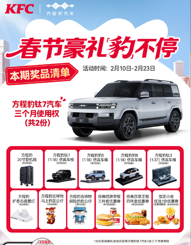 KFCB方程豹与肯德基正式跨界合作,2月10日—2月23日推出新春联名活动,紧
