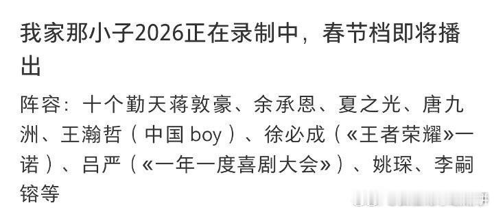 🥭我家那小子2026将在春节档播出嘉宾阵容:蒋敦豪、余承恩、夏之光、唐九洲、王瀚哲、徐必成、吕严、姚琛、李嗣镕等