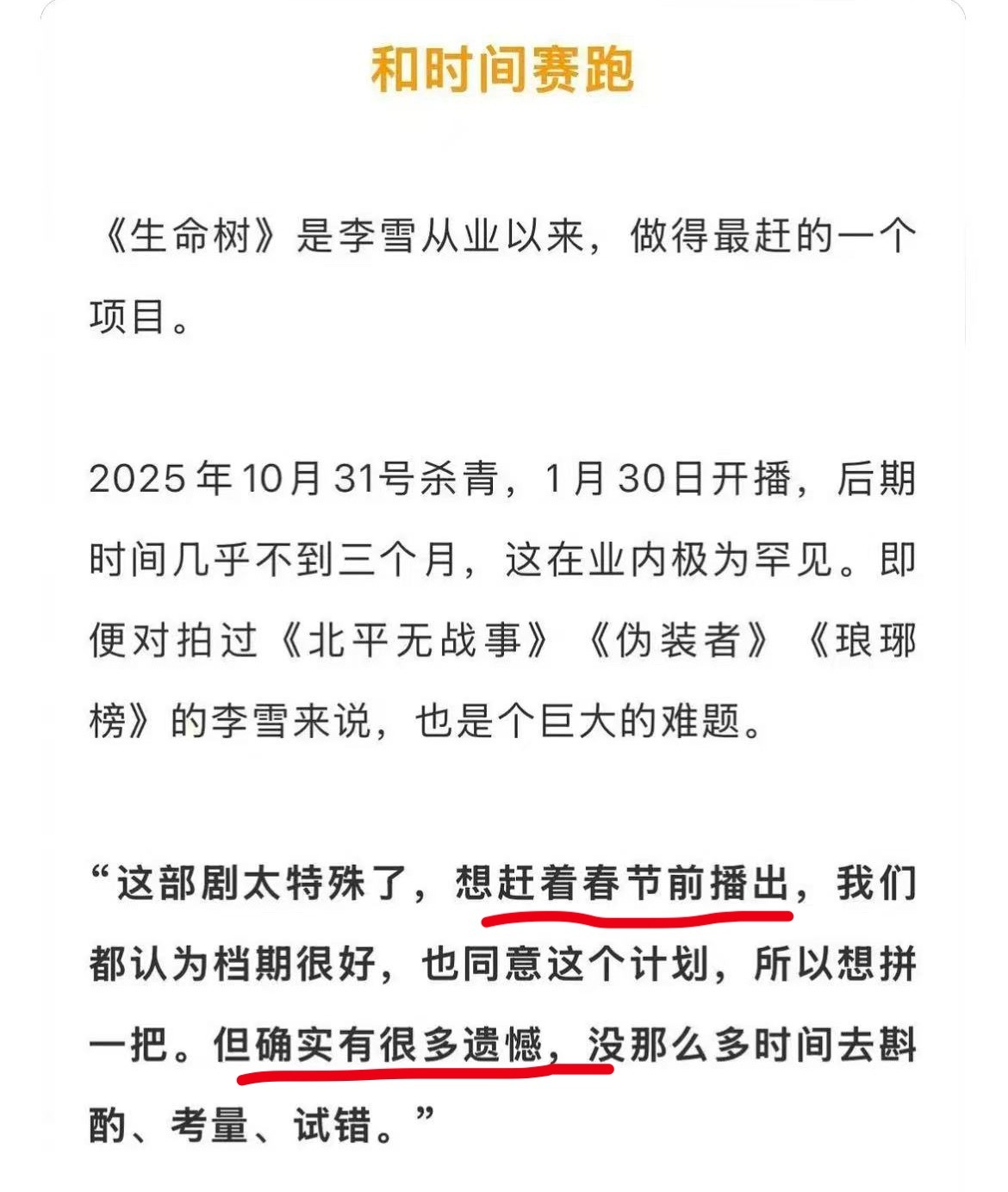 生命树从杀青到播出不到三个月,又不是什么小成本小体量的作品,为了赶所谓的好档期,