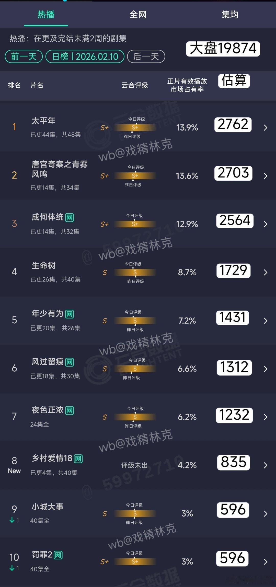2.10云合:唐宫奇案13.6%成何体统12.9%