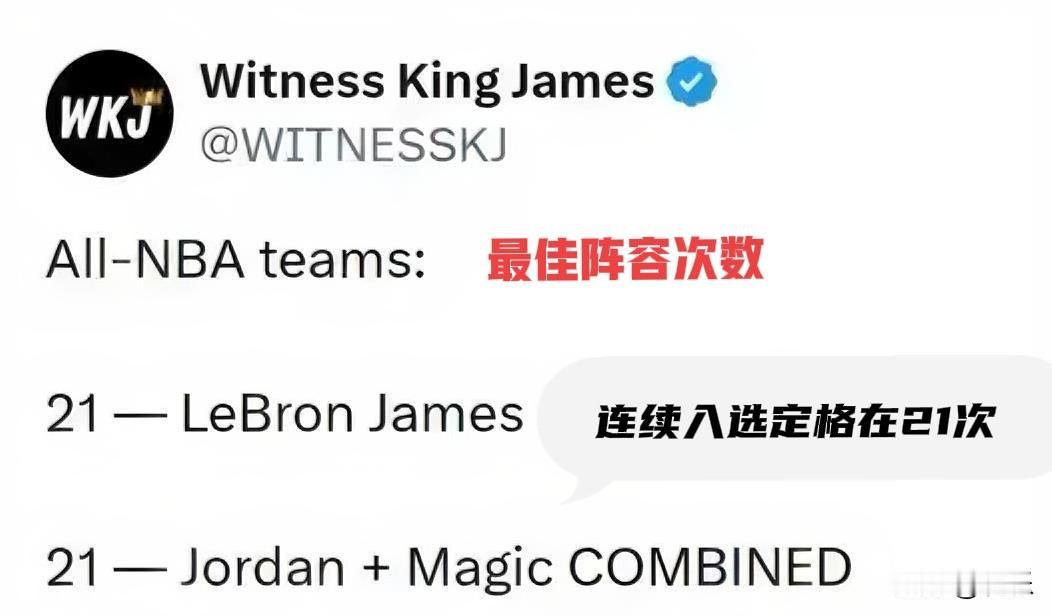 有一个奖杯乔丹碾压詹姆斯,有知道是什么奖项吗? 左边是总冠军数量 中间是FMVP数量 右边是常规赛MVP数量 最下面这一排是什么奖项呢?乔丹居然有10次! 当然,有一项荣誉詹姆斯也是碾压乔丹的,那就是入选最佳阵容次数,詹姆斯21次,而乔丹只有11次。