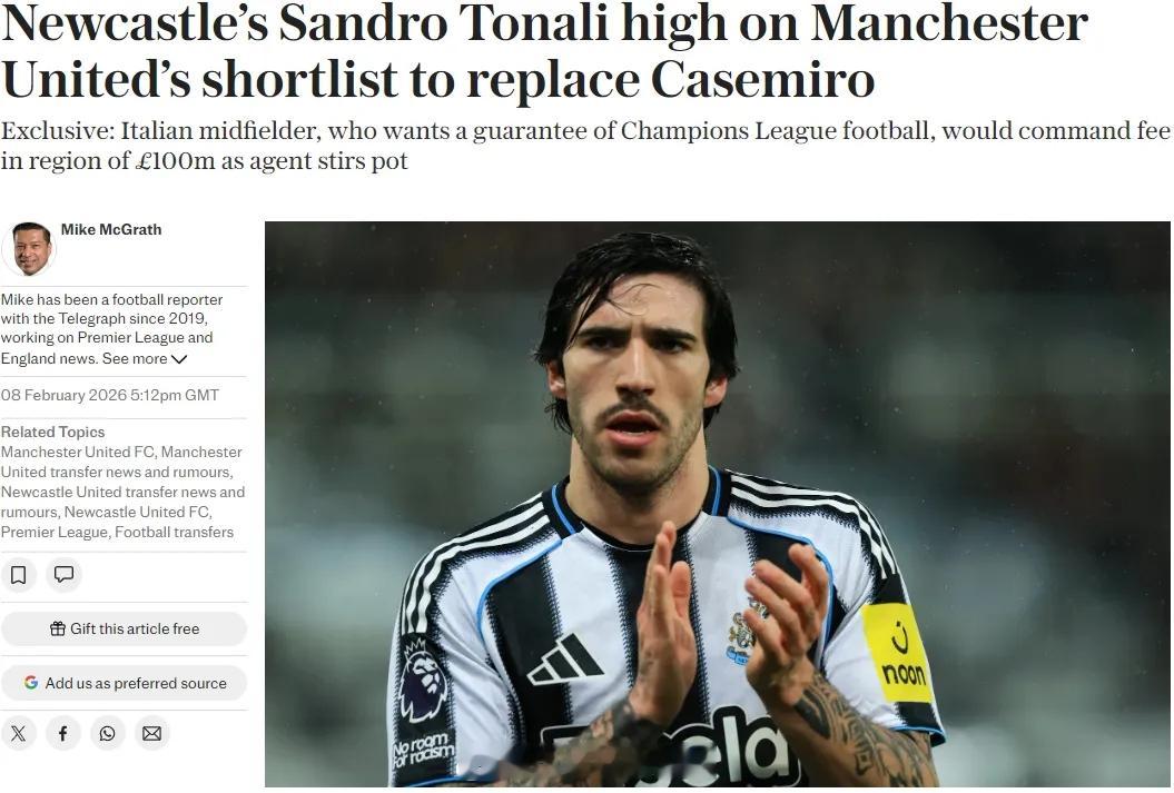 托纳利目前的合同2029年到期,因此意大利人的价格会很高,据悉纽卡对他的要价将在1亿英镑,并且他们希望留住这名中场。
