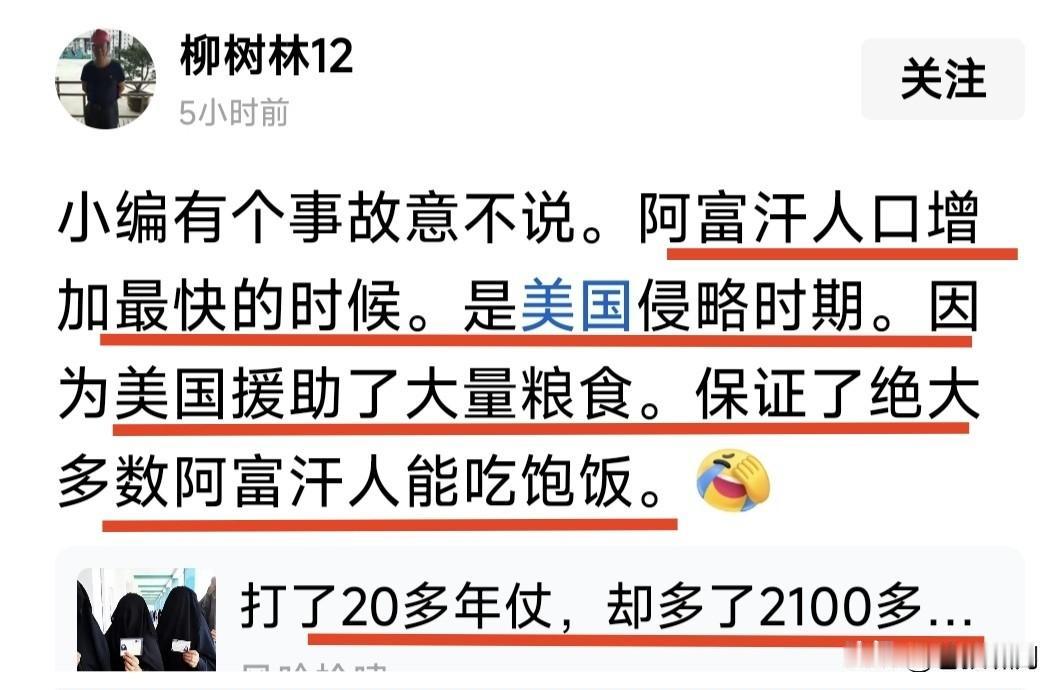 苏联与美国争霸,先后控制阿富汗30年!都没建立稳定政权,最后被民族武装搞得疲惫不堪,不得不铩羽而归。 苏联控制10年,将其改造成苏式体系,但有外部势力捣乱,武装冲突不断,最后被迫撤离,还导致苏联因此解体。 然后美军进入,扶持扎伊尔政权。但有人支持民族武装,仍无法稳定局面。最终狼狈撤出,塔利班武装掌握政权。 苍狼看到一些资料,说阿富汗人口,在苏联控制时期是下降的,美军控制时期翻倍增长。原因是何?因为老美供应粮食,有饭吃有力气生孩子!目前阿人口4千多万,有近一半是那时增加的。 还看到一些图片,说美军撤离时,许多阿富汗人涌向军车飞机,要跟他们一起离开。但美军只能带走很少一部分,有的只能带走女童孩子,什么原因? 最后说明一点:无论苏联还是美军控制时期,阿富汗都是世俗社会,女性不用穿长袍戴面巾。塔利班掌权后,她们被恢复“长袍面巾”,不能参加工作! 有时候真的想不明白:阿富汗的民族主义情绪,为何如此根深蒂固?对于阿富汗的国家发展与社会进步,人民生活逐步提升,到底是有益还是有害呢? 忽然想到一句,不知何人说的名言:某些族群的认知,对得起他们所经受的苦难!当然此话不单指阿富汗,还有更多泛指,比如“哈真胡”控制的人群! …………