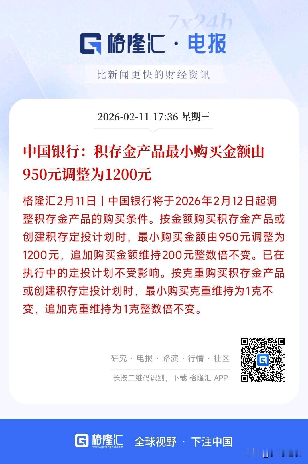 又给黄金降温了,积存金产品开始上调价格 中国银行上调了积存金的最小购买金额,从950元上调到1200元。后面追加买还是200元的整数倍。 这次调整也是为了给过热的金价市场进行降温,但是这次只是单家银行、单一产品的门槛微调,不是全市场政策,而且资金体量小、影响范围窄,不会分流资本市场的资金。 目前这个阶段,金价基本上已经稳定了,主要还是看地缘政治冲突和关税的问题是否发生,还有就是美联储的政策,具体什么时候能够降息。