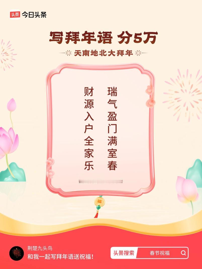 写拜年语送祝福新春拜年送祝福!我的祝福是:“财源入户全家乐,瑞气盈门满室春”!快来一起写祝福吧戳这里,一起领红包>