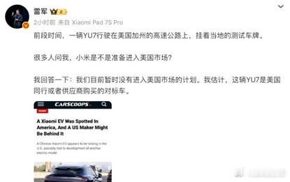 事件发酵后,小米的当家人雷军坐不住了。2月10日,他亲自在社交平台回应,给猜测泼了盆冷水——小米汽车目前暂时没有进入美国市场的计划。在他看来,这辆车大概率就是被美国同行或供应商买去搞对标研究的。
