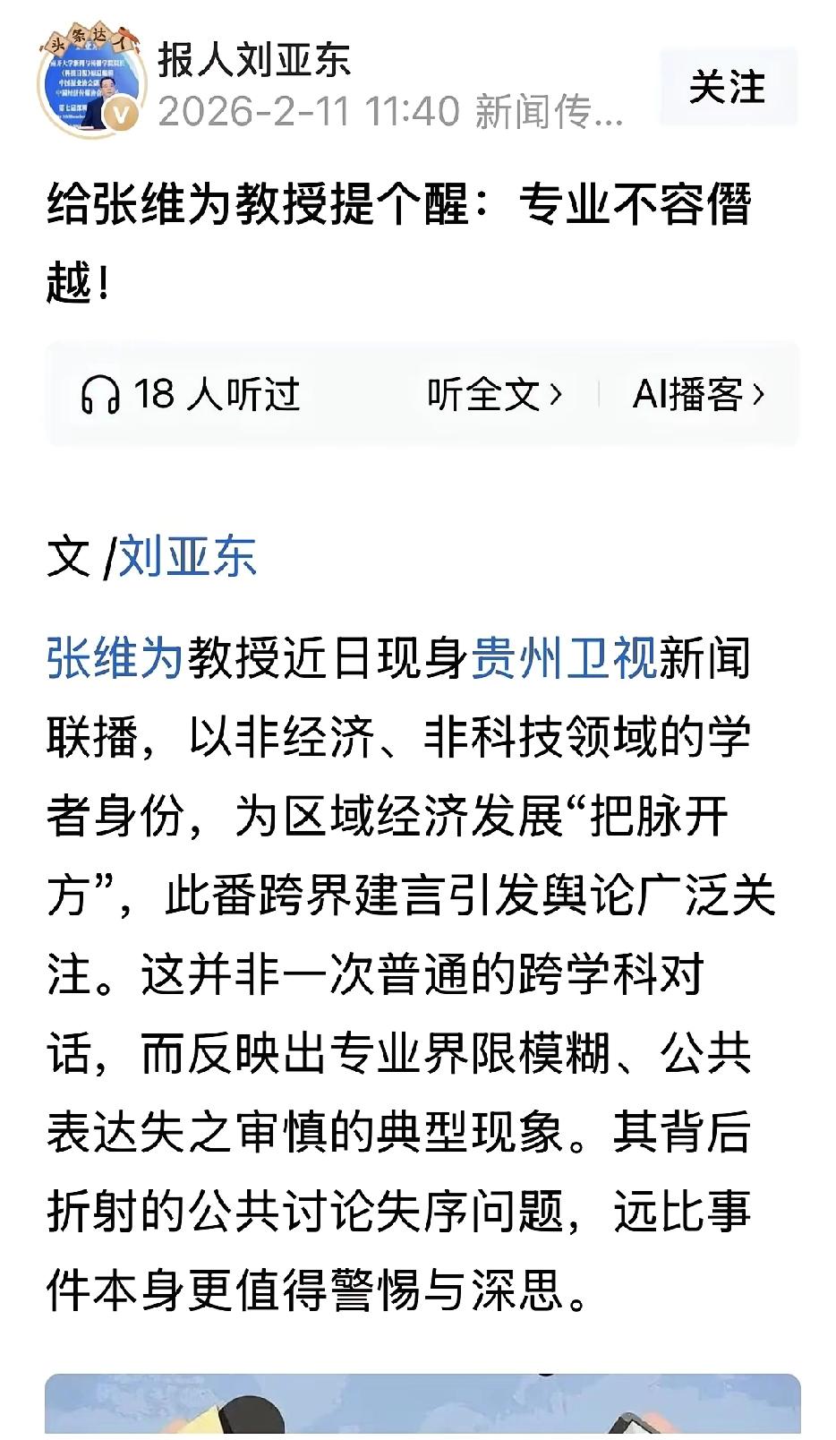 惊奇,报人刘亚东指名道姓了。虽然说文人相轻,但大都顾及情面的,因为都是高知大V懂自尊的。但前科技报刘总编一定是憋不住了,指责张教授“僭越、跨界、公共表达失之审慎”一大堆问题,有点上纲上线味道。 受邀接受一个电视采访而已,本来张教授的研究院是一个宏观性研究机构,又不是出可行性研究报告或论证报告,前刘总编不应该大动肝火的。 刘亚东应该也转战于自媒体,而自媒体上跨界评论专家学者多了去了。比如何院士、比如易中天大师、比如经济大家张维迎、许小年,比如画家陈丹青等等一堆人指点江山激昂文字,报人刘亚东绝不会说他们“僭越、跨界”,甚至会点赞。 说来说去,道不同不相为谋,没必要显摆自己专业。