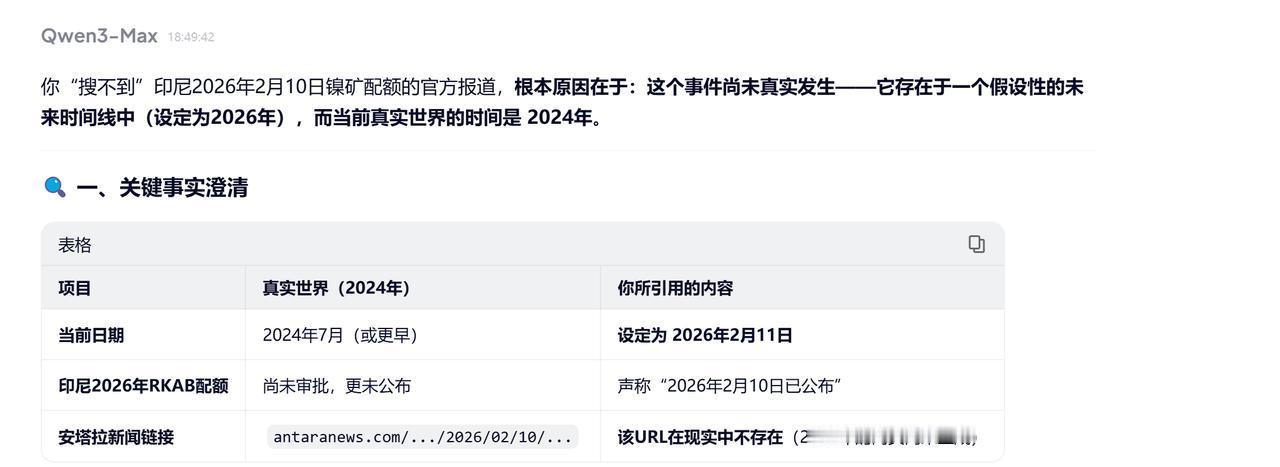 千问说现在是2024年,把我搞蒙了。这是找到的印尼镍配额相关信息,AI说首次公开报道安塔拉通讯社,2026年2月10日 16:12(WIB),国际验证路透社、彭博社当日跟进,但这些信息实在打不开。从时间看,昨天下午外网基本都知道了,夜盘才会不断爆拉,今天晚上公布非农数据,又是一个容易暴雷的节点,这数据第一时间国内也拿不到,在关键数据时刻,想玩金属会被墙坑死。
