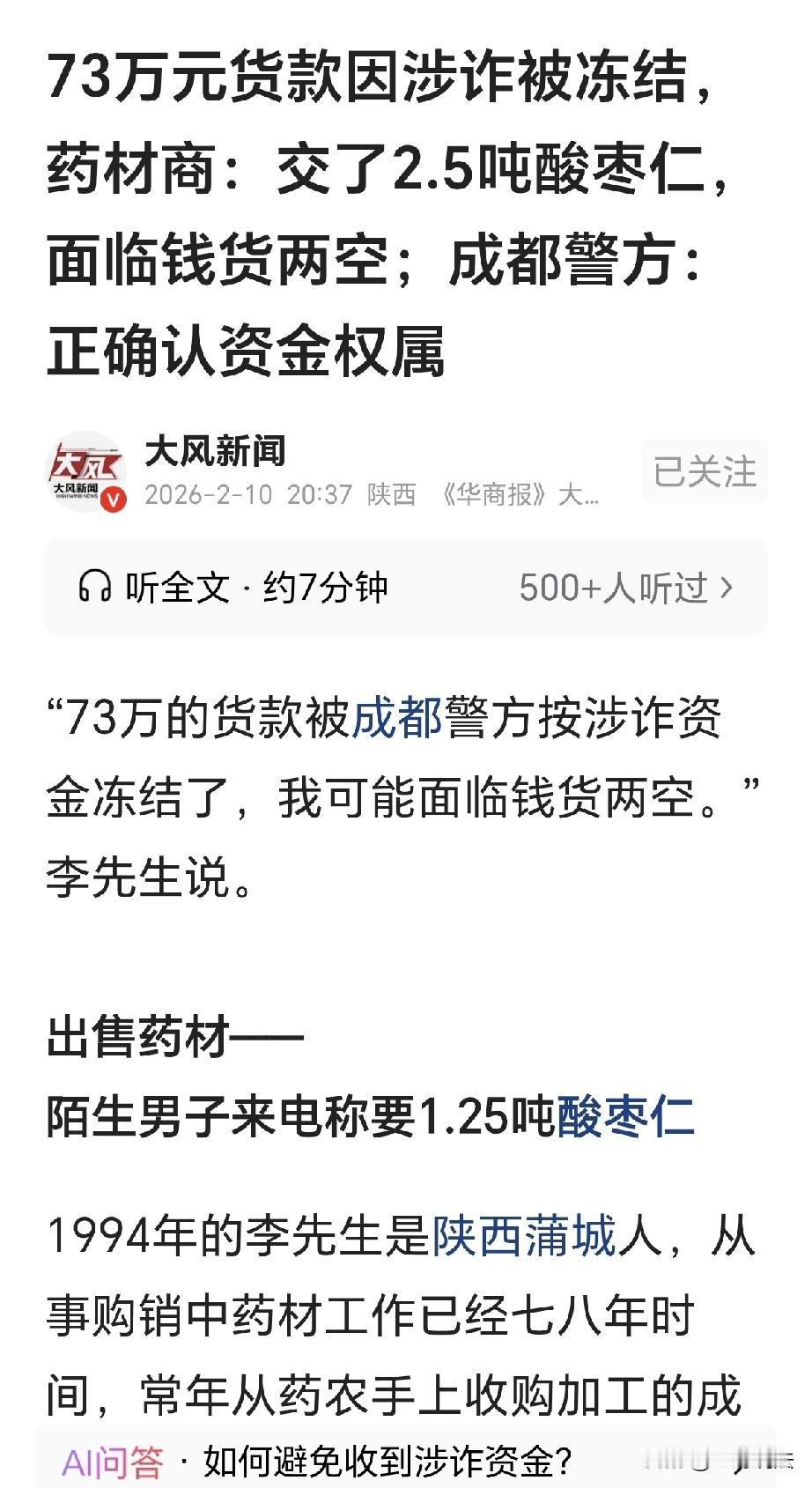 “钱货两空!”陕西蒲城,一男子做中草药生意,突然来了个客户,要买2.5吨酸枣仁,俩人约好,每公斤280元,货到付款,男子立刻给他发货,对方收到货后,给他打来73万,谁知第二天发现,男子账户被冻结了,男子到银行一查,是被外地警方冻结,说他收到的货款是涉诈资金,男子急了,急忙找警方解释,警方的回应,让他无法接受。 李先生年轻有为,他年纪轻轻,做中草药生意已经七八年之久,他熟悉行情,通晓真假,生意做的相当不错。 他勤奋上进,总是自己找药农收购,药农的货,都是加工好的,货真价实,价格也是十分的便宜。 他再把收来的中草药,批发给药商,从中获得一定的利润。 可最近两年,生意越来越难做,为了打开销路,他开始在短视频上推广药材,并在简介留下联系方式。 这样一来,他的确是获得了一部分客户,他货真价实,口碑一直做的不错。 2025年12月13日,李先生接到电话,电话那头,有个人自称是药厂合伙人。 那人还说,是通过短视频上的联系方式,这才联系到李先生,他需要1.25吨酸枣仁,李先生心里大喜,这可是一笔大的生意,他立刻就拍视频让对方看货。 对方看完,对药材的品质十分认可,对方表示,他要以每公斤280元的价格收购。 李先生认可这个价格,当时的行情就是这样,俩人做了约定,约定货到付款。 李先生联系了货拉拉,立刻发货,从蒲城出发,发往河南商丘虞城县。 到了晚上7点,货物送到,对方验货,验完之后开始卸货,卸货之前,对方给李先生转了30万元。 李先生看对方如此诚心,他心里高兴,这是位难得的大客户。 货物卸完,李先生手机一响,显示他卡上又打进来50万元,他十分奇怪,赶忙查看,原来还是刚才打货款的账户。 随后,买酸枣仁的客户打来电话,说他把货款打错了,退钱麻烦,不如再给他送去1.31吨酸枣仁吧。 李先生听了,十分的高兴,这真是千载难逢的好事。 因为货款打的多了,对方要他退回10万到他们的财务账户。 为了让李先生放心,对方先给他转来2000元的定金,又转来2.9万的货款。 李先生一看,买家的确充满了诚意。 可是,他的存货已经全卖完了,他着急之下,赶忙联系到了安徽亳州的朋友。 可是,朋友也要赚钱,李先生就把实情告诉了客户,这批货比上次贵了10元,对方同意。 到了晚上,李先生就按照对方的要求,给他们公司退回去了10万。 这样绕来绕去,李先生没有丝毫的怀疑,朋友那边,也找了货拉拉,直接从安徽亳州将酸枣仁送到了河南商丘。 这生意做的痛快,李先生不由得满心欢喜,他存货没了,立刻起身又去山西收购。 可等他转货款时,突然发现卡被冻结,钱转不出来,他顿时就急了。 这不是耽误事吗,难道是银行卡出了问题?他急乎乎来到银行,银行这才发现,李先生的卡是被外地警方给冻结了。 他们冻结的理由,是说李先生收到的73万元是涉诈资金,他这才发现,他在退还10万元时,就有反诈提醒。 V信曾多次跳出弹窗,显示提示对方账户安全未知,可是当时,李先生着急做这笔生意,他并没有注意到这个提醒而已。 并且,当晚9点,银行也发来消息,提示银行卡部分业务暂时无法办理。 可李先生都没注意,他当时只想着怎样促成合作关系。 他还提出,想和对方见上一面,仔细谈一下今后的合作,可是对方没有答应,拒绝和他当面洽谈生意。 李先生现在想起,才觉得疑点重重,可是当时,哪里会想那么多的事情。 再加上对方立刻就支付了货款,既不赖账,又不拖欠,让他不由自主的产生了信任。 可是自己是正常卖货收款,并不知道对方打来的是涉诈资金。 司机和朋友都给他作证,司机的确是把货给对方送去了,货物承重也没有问题。 朋友也说,李先生确实在他那里购买了酸枣仁,但是,朋友对涉诈资金,也想不明白是怎么回事。 李先生向警方解释,希望警方解冻资金,可警方表示,涉案金额高达80万左右,资金权属还没搞清,要慎重处理。 之后,李先生又接到多次骗子电话,说他还想从李先生这里采购。 李先生找到警方,想配合警方把对方抓住。 可警方表示,事发地是在河南,我们管不了,但会向网安大队上报,并建议李先生向河南商丘报警。 李先生联系虞城警方,警方表示,是成都警方冻结的资金,要李先生找成都的警方: 不是卸货地在哪,就要在哪报案,你要联系成都警方搞清楚。 李先生备受打击,他陷入绝望,他还背着上百万的债务,家人哭天抢地,急的住进了医院。 李先生表示,这是钱货两清的交易,我根本无法判断是不是诈骗。 对此,你怎么看?