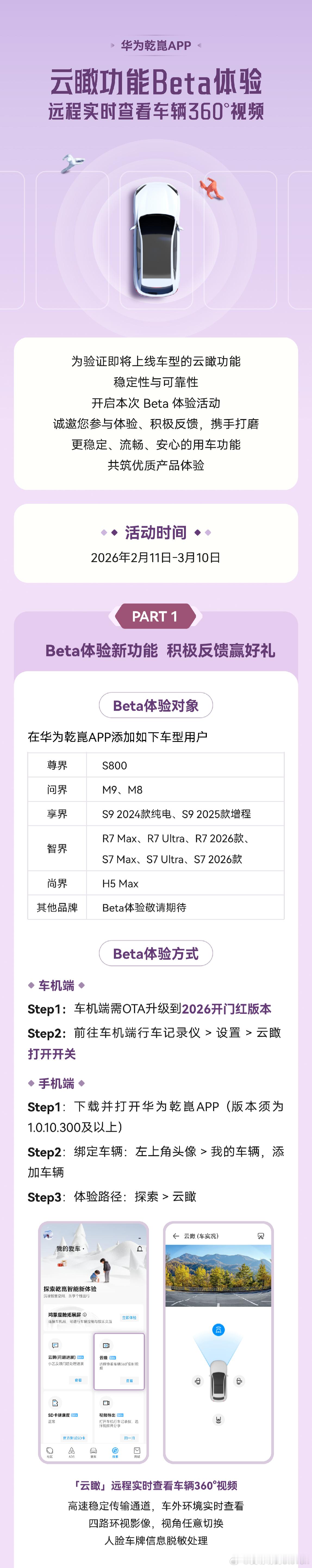 鸿蒙智行优先Beta云瞰功能,支持远程实时查看车辆360视频。ps.需要配合华为乾崑APP使用。鸿蒙智行