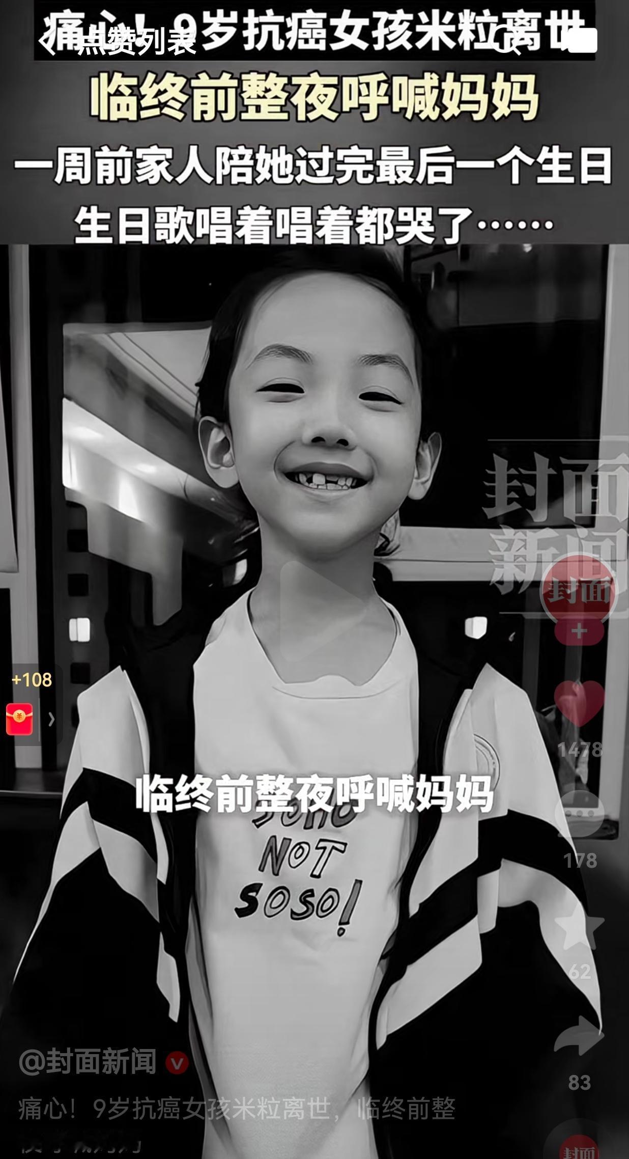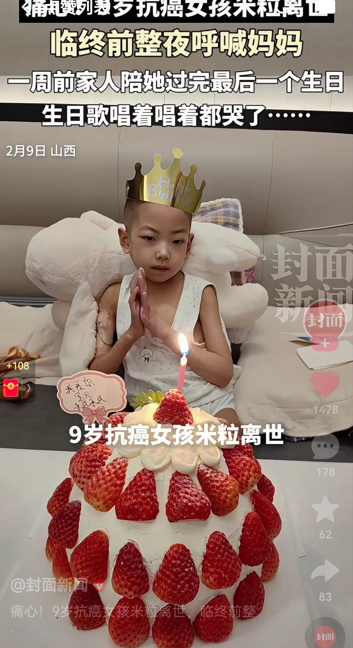 看哭了!2月9日,山西,一9岁的抗癌女孩米粒,最终,还是没有熬过这个冬天,离开了人世。 一周前,家人刚给她过完9岁生日。照片里的她,戴着金色小皇冠,瘦得胳膊上的血管都清晰可见,却还是努力对着草莓蛋糕许愿。 蛋糕上插着一根蜡烛,旁边的小牌子写着“我爱你宝贝,永远永远”。这短短9个字,是家人能给她的,最简单也最厚重的爱。 谁能想到,那是她这辈子最后一个生日。  据了解,米粒确诊横纹肌肉瘤已经一年多了。 从活蹦乱跳的小姑娘,到化疗后头发掉光、瘦得脱了相,她才9岁啊,就经历了成年人都扛不住的疼。 妈妈为了陪她抗癌,也剃光了头发,说“妈妈和你一起光头,你不是一个人”。 可就算这样,命运还是没手下留情。 生日刚过,米粒的身体就急剧恶化,出现了意识模糊、幻听幻觉的症状。她虚弱地问妈妈:“你还是以前的那个妈妈吗?”甚至在疼痛难忍时,对妈妈说出:“我想去世了。”这句话一出,听到的人真的太难受了,忍不住泪流满面。 据报道,米粒离世前夜,因为不舍,整夜都在喊“妈妈”,一遍又一遍。 我光是看到这几个字,心就揪成了一团。 那是她对这个世界最后的留恋,是对妈妈最本能的依赖。可她才9岁,连“死亡”是什么都未必真正懂,就被硬生生拖进了无边的黑暗里。 在她去世后,米粒的妈妈忍痛发文:“宝贝,你陪妈妈一程,妈妈念你一生。”一句话,道尽了对女儿的不舍与思念。 网友看到后评论说:“看着看着眼泪就掉下来了,这么小的孩子,到底造了什么孽要受这种罪。” 也有的网友说:“当妈的根本不敢看,一看就哭,换谁都扛不住。” 还有的网友说:“孩子疼得受不了才会说想去世,她不是不怕,是真的扛不住了啊……” 我们总说,要珍惜当下,可真正能做到的,又有几个人? 我们会为了工作熬夜,为了鸡毛蒜皮的小事吵架,为了没赚到的钱焦虑。却唯独忘了,能健健康康地陪在家人身边,能大口吃饭、大声笑,本身就是一种天大的幸运。 米粒用她短暂的一生,给我们上了最沉重的一课:生命有时候真的很脆弱,脆弱得像一张纸,风一吹,就碎了。 所以,大家一定要保护好自己的身体,没有好身体,什么都没有了!