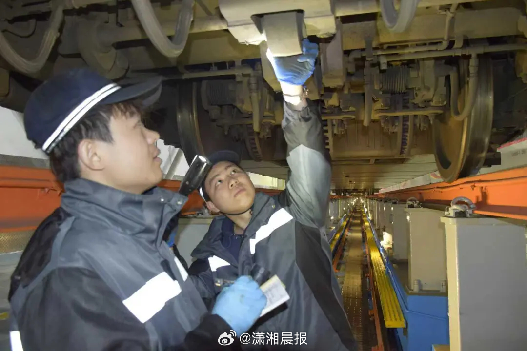 检修标准精确至毫米。从车顶高压设备到车内上万个零部件,机械师需完成超百项检查。“扭矩误差不得超过4%,0.1毫米的裂纹也绝不放过。”唐昊指尖轻触螺栓,便能感知细微松动。伴随着清脆的“咔哒”声,他在检修单上郑重打钩——这样的动作,一夜重复上千次。