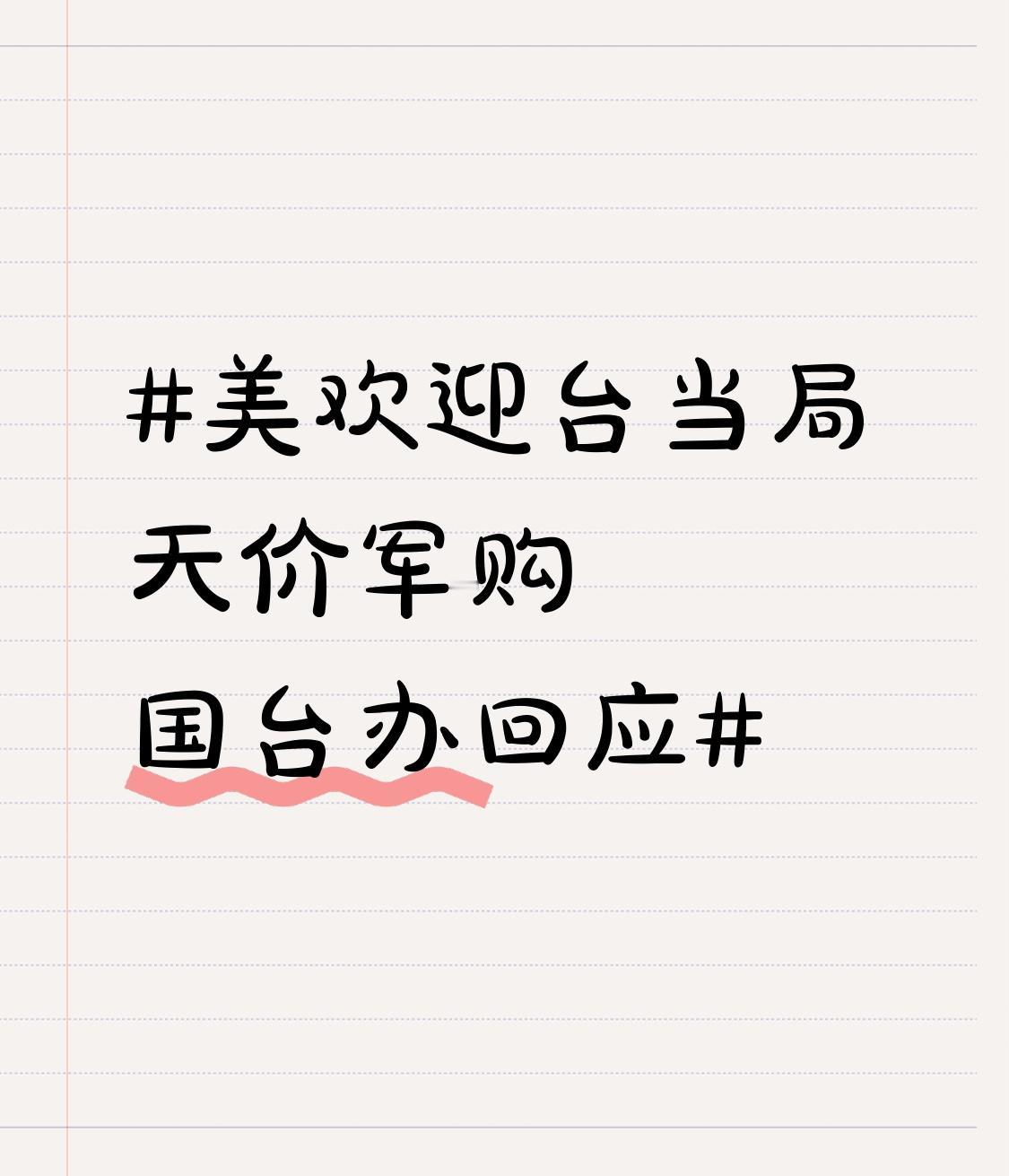 美欢迎台当局天价军购 国台办回应 美欢迎台当局天价军购,这事儿就是美国在背后搞鬼,把台湾当“提款机”呢。台当局花着巨额的钱买那些军事装备,以为能靠美国撑腰,简直是异想天开。美国就是想搅乱台海局势,从中渔利。 国台办的回应太给力了,这是在给台当局和美国敲响警钟。台湾是中国的一部分,这是铁打的事实。美国这种行径就是对中国主权的严重侵犯。台当局还不醒悟,继续在错误的道路上越走越远,最终只会把台湾民众推向深渊,这是在拿台湾的未来开玩笑。