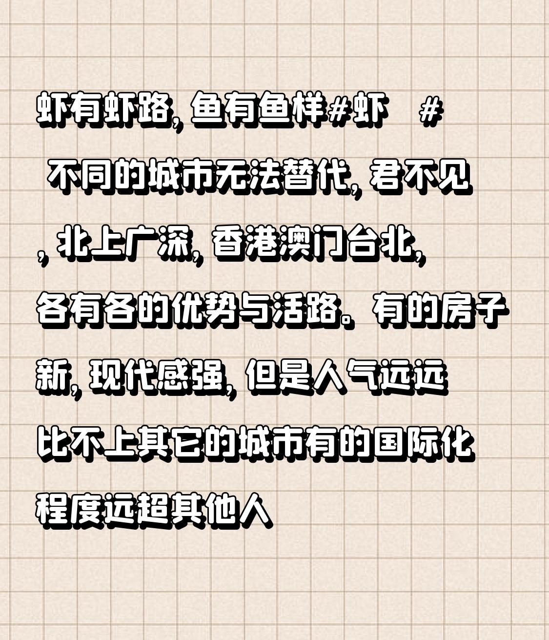 虾有虾路, 鱼有鱼样虾 🦞 不同的城市无法替代, 君不见, 北上广深, 香港澳门台北, 各有各的优势与活路。 有的房子新, 现代感强, 但是人气远远比不上其它的城市 有的国际化程度远超其他人[6]