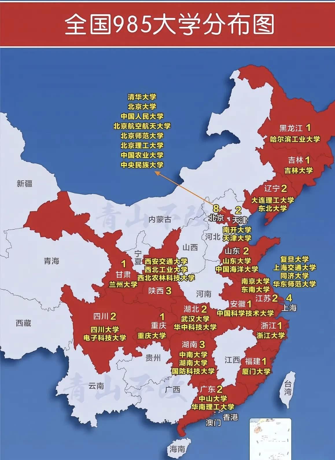 中国211大学基本上有照顾因素,每个省至少都有一所,但是985大学就要凭实力了。中国最遗憾的就是河南河北了,作为人口大省,基础教育也很好,就是没有985大学。不过河北有一所985大学的校区,东北大学秦皇岛校区,河南当年要是也像深圳那样引进985大学的校区就好了。