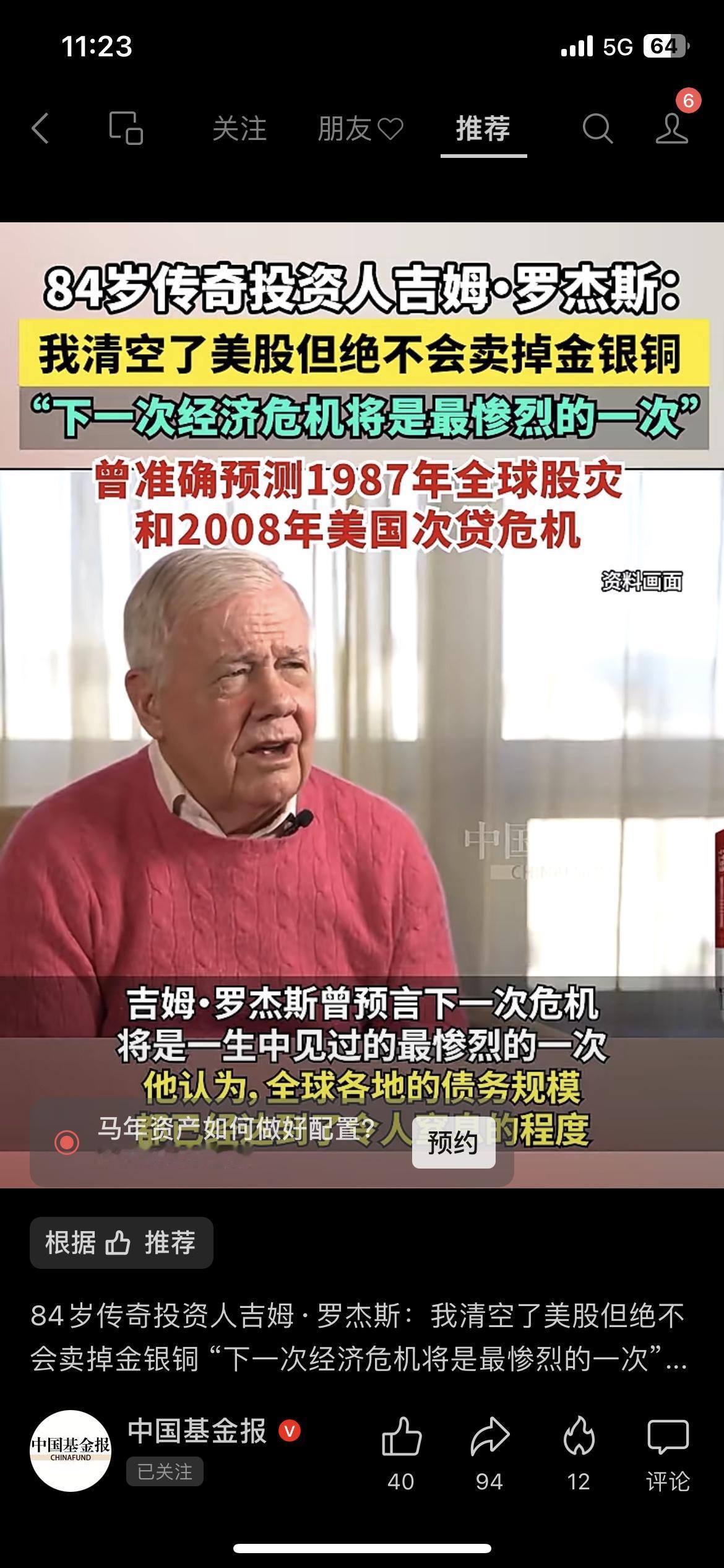 84岁投资大佬罗杰斯重磅发声:清空全部美股,坚决持有金银铜,还重仓中国股票,直言下一次经济危机将是最惨烈的一次! 说实话,这不是危言耸听,是全球债务膨胀后的必然预警。普通人别被恐慌带节奏,适当配置金银铜避险,深耕国内优质资产,才是最稳妥的应对方式。 你会配置金银铜做避险吗? 吉姆罗杰斯 经济危机 金银铜