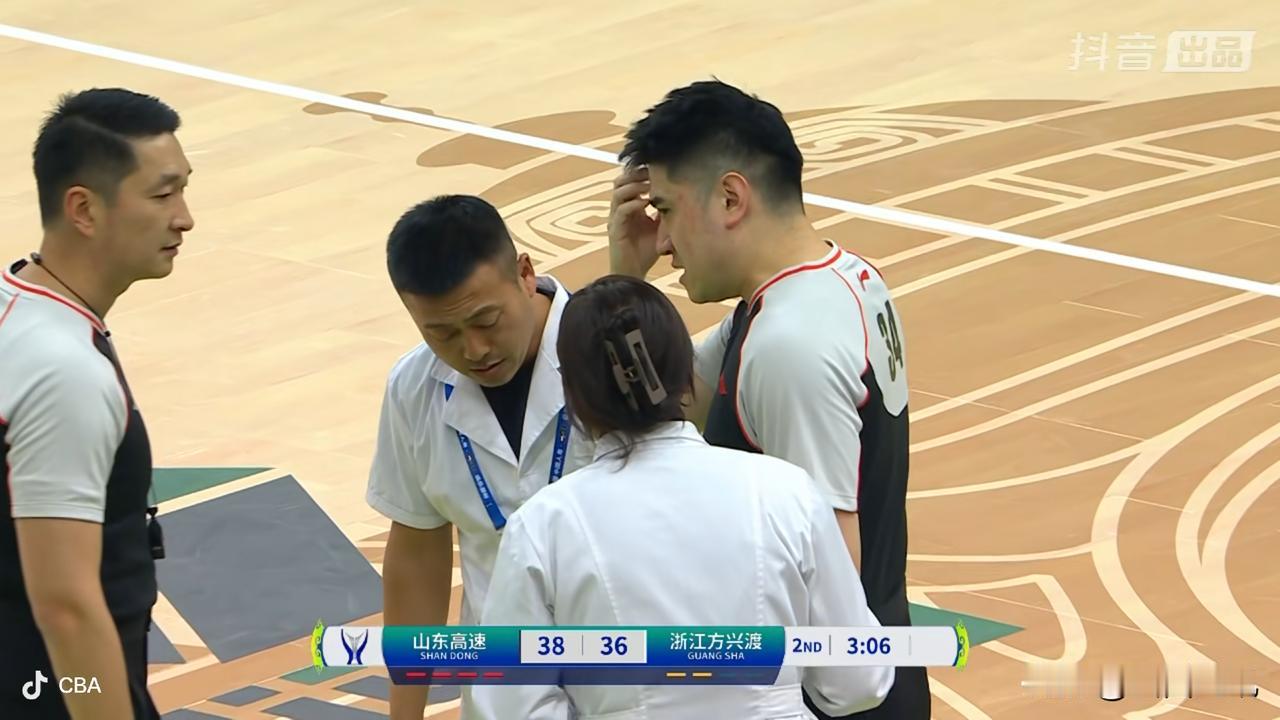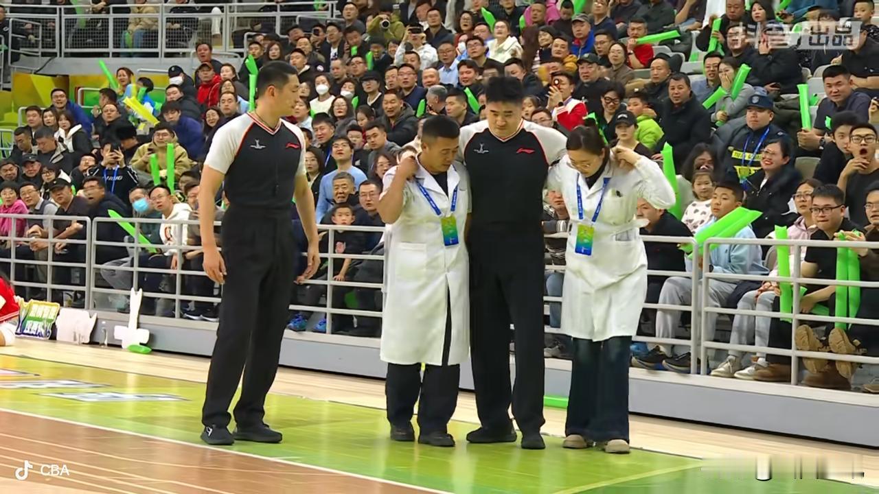 裁判员突然伤退!俱乐部杯季军争夺战出现意外情况。 俱乐部杯山东高速男篮与浙江方兴渡男篮三四名争夺战进行到次节还剩3分06秒时,裁判员李金突发受伤,另外一个裁判员叫停比赛,喊来了医护人员。当医护人员要进场救助球员时,被告知是场外的裁判员出现的伤情。医护人员来到场边,经双方短暂交流,得知李金已经不能走路了,被医护人员架出场外送至医院检查治疗!