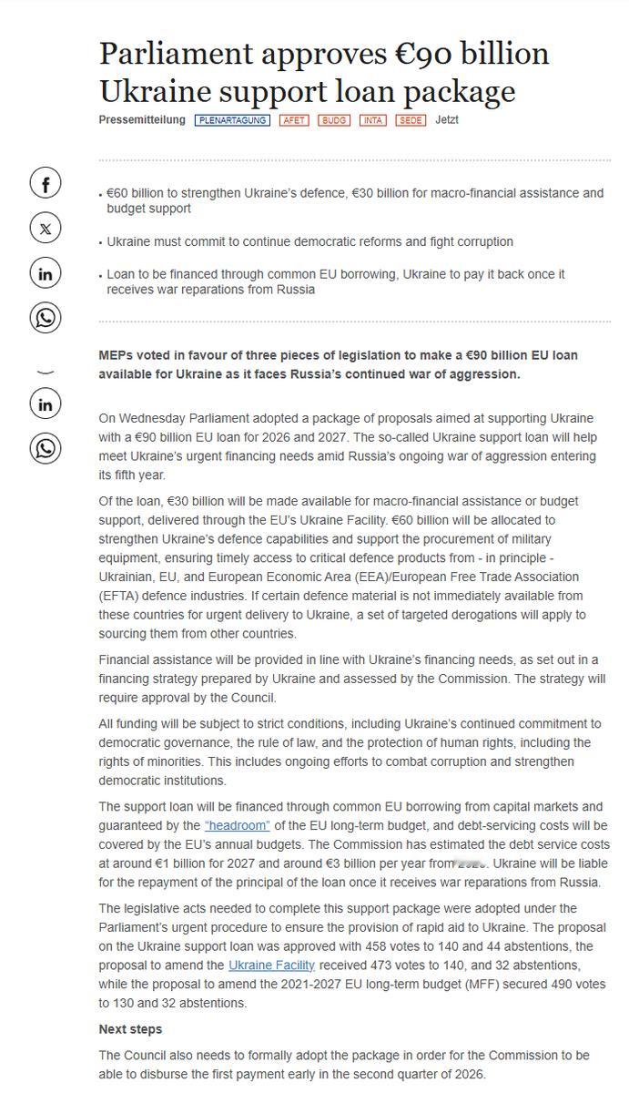 欧洲议会批准了此前欧盟各成员国达成一致的900亿欧元的乌克兰贷款计划,458名议员投赞成票,140票反对,44票弃权。该计划准备在2026至2027年度向乌克兰提供900亿欧元援助贷款,其中600亿欧元的资金将用于乌克兰的国防需求,另外300亿欧元将用于乌整体国家预算。在去年12月召开的欧盟峰会上,欧盟领导人同意,将通过欧盟共同借款的方式,为乌克兰提供援助资金。俄乌局势最新进展