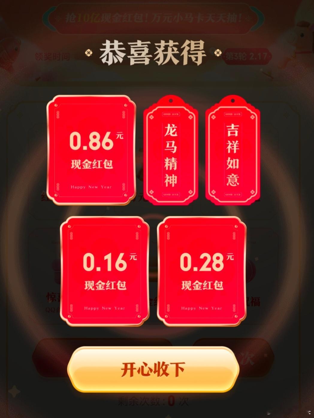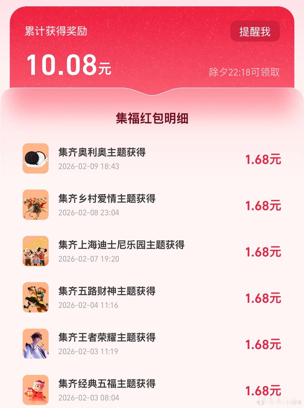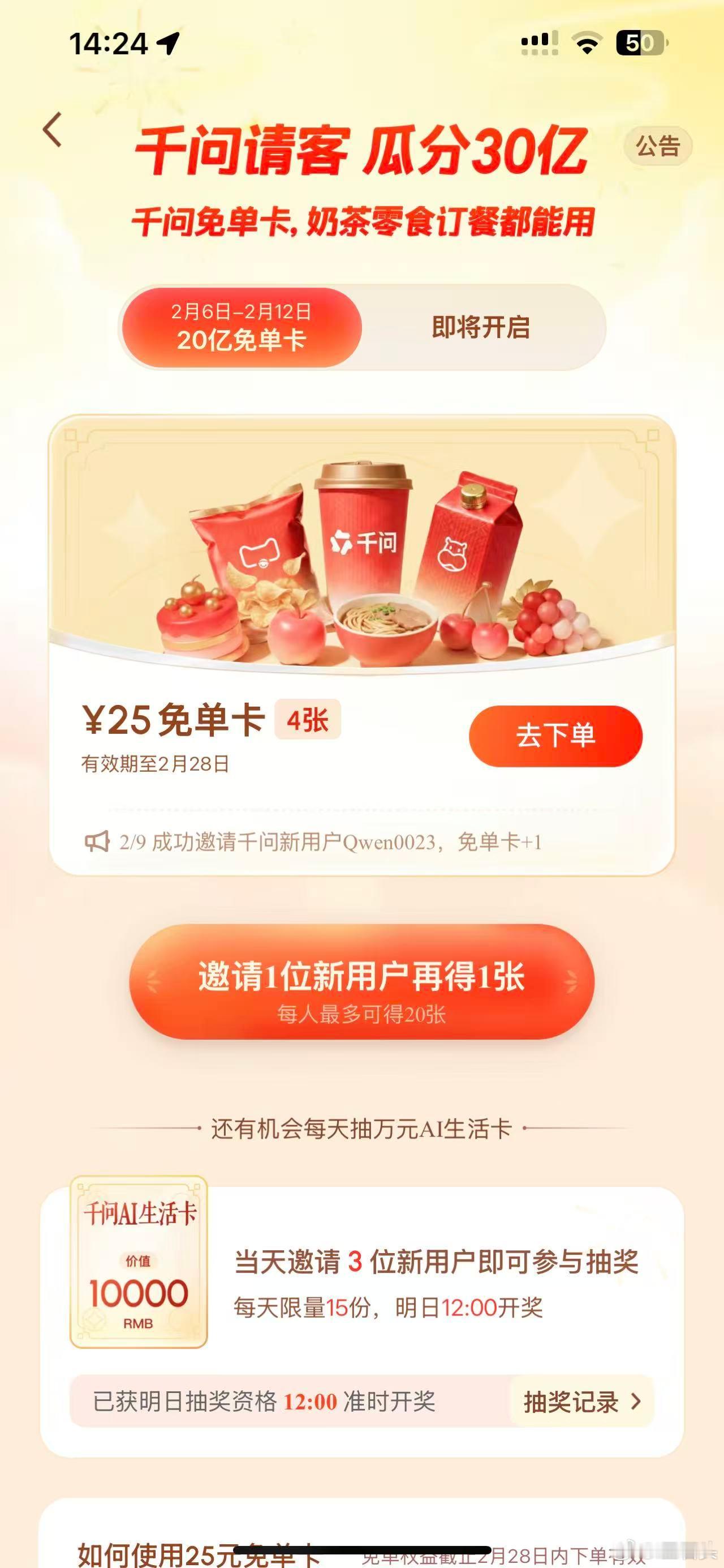 现在有一些马年羊毛可以薅,大家有时间的可以玩玩。支付宝的集五福,每套1.68元,可以集齐20套,所以最多可以拿33.6元。然后是元宝的现金红包,这个比较少,第一批是很大的。再就是千问的外卖免单卡,邀请就送25元外卖红包,最多可邀请20人,加上新用户的那张,一共21张,这个真可以薅,我都搞到好几张卡用掉了。最后如果你是比亚迪车主,即将上线的马年集徽享好礼,瓜分1亿积分活动也可以关注一下,2月13日开始,这次设置了1亿积分的奖池,积分都可以兑换礼品或者购买保养这些,也可以参与一下。集五福千问比亚迪