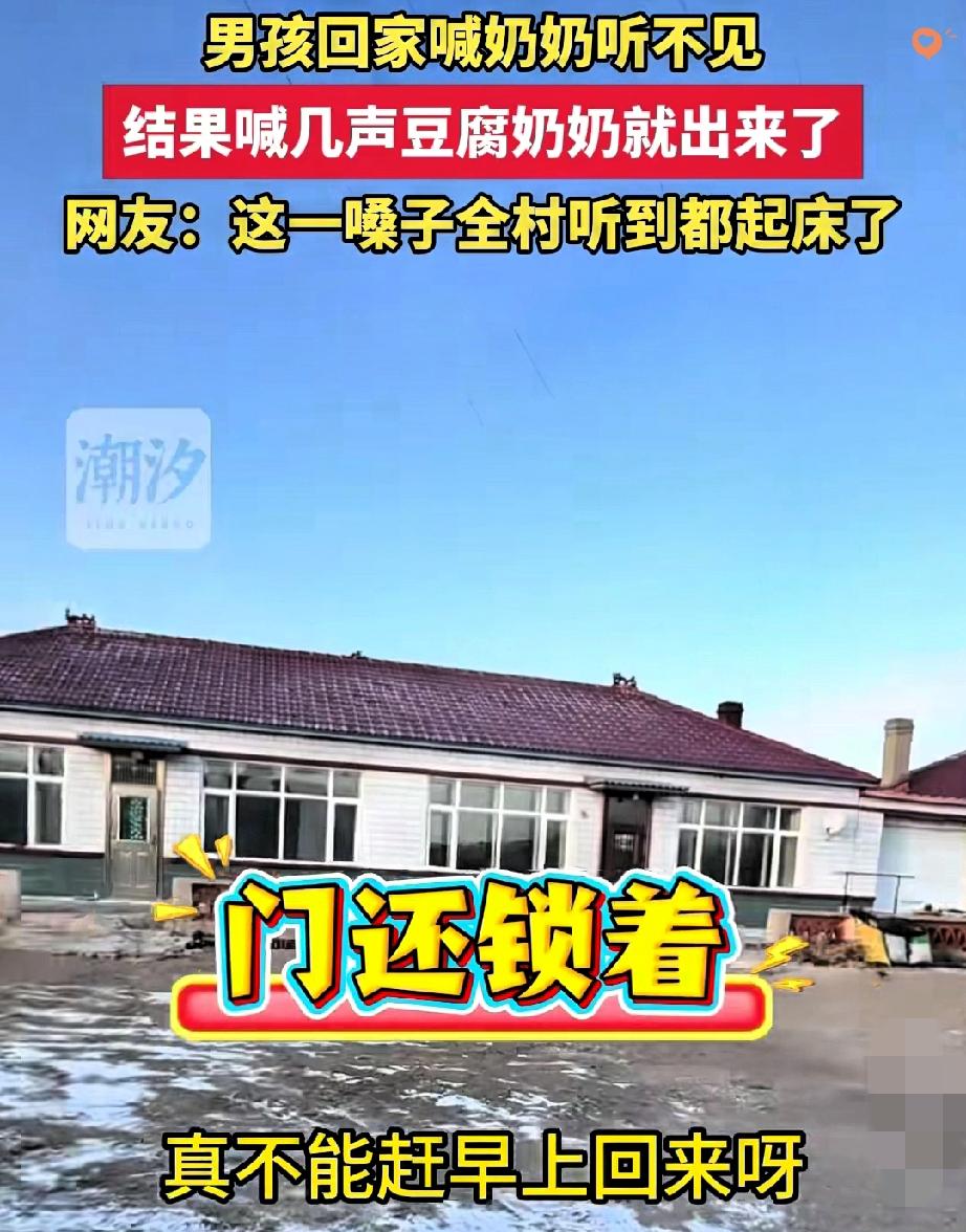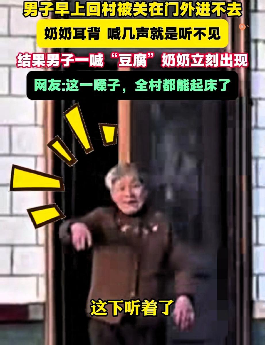 笑不活了! 喊奶奶没反应,喊“豆腐”奶奶立马出现,这祖孙俩也太可爱了! 黑龙江小伙回老家看奶奶,连喊几声奶奶都没动静,年纪大了耳朵有点背。 结果小伙灵机一动,喊了一声“豆腐”,下一秒奶奶就急匆匆开门出来了。 原来奶奶就爱吃豆腐,对这两个字格外灵敏,比喊名字还好使。 看着又好笑又暖心,老人的快乐就是这么简单纯粹。 其实哪是耳朵背,分明是“选择性收听”,心里惦记的事,再远也能听见。 这朴实又可爱的瞬间,藏着最浓的烟火气和亲情。 你家老人有没有这种专属“关键词”,一喊就灵的那种?